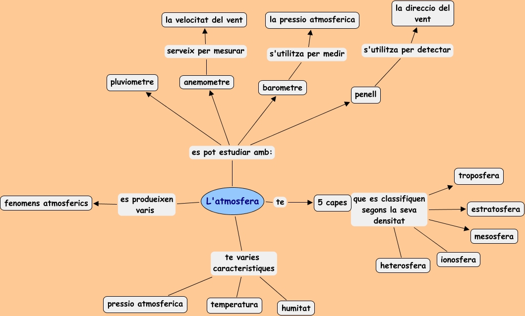 Este Cmap, tiene información relacionada con: la atmosferaa, 5 capes que es classifiquen segons la seva densitat mesosfera, 5 capes que es classifiquen segons la seva densitat estratosfera, 5 capes que es classifiquen segons la seva densitat heterosfera, 5 capes que es classifiquen segons la seva densitat troposfera, L'atmosfera es pot estudiar amb: penell, L'atmosfera es pot estudiar amb: barometre, L'atmosfera es pot estudiar amb: anemometre, penell s'utilitza per detectar la direccio del vent, L'atmosfera es produeixen varis fenomens atmosferics, L'atmosfera te varies caracteristiques pressio atmosferica, L'atmosfera te 5 capes, L'atmosfera es pot estudiar amb: pluviometre, L'atmosfera te varies caracteristiques humitat, 5 capes que es classifiquen segons la seva densitat ionosfera, L'atmosfera te varies caracteristiques temperatura, barometre s'utilitza per medir la pressio atmosferica, anemometre serveix per mesurar la velocitat del vent