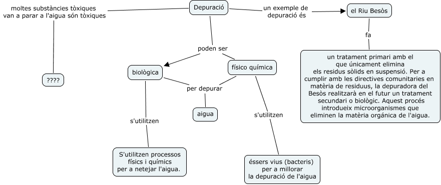 Este Cmap, tiene información relacionada con: depuració, el Riu Besòs fa un tratament primari amb el que únicament elimina els residus sòlids en suspensió. Per a cumplir amb les directives comunitaries en matèria de residuus, la depuradora del Besòs realitzarà en el futur un tratament secundari o biològic. Aquest procés introdueix microorganismes que eliminen la matèria orgánica de l'aigua., Depuració un exemple de depuració és el Riu Besòs, Depuració poden ser biològica, biològica per depurar aigua, Depuració poden ser físico química, Depuració moltes substàncies tòxiques van a parar a l'aigua són tòxiques ????, físico química per depurar aigua, físico química s'utilitzen éssers vius (bacteris) per a millorar la depuració de l'aigua, biològica s'utilitzen S'utilitzen processos físics i químics per a netejar l'aigua.