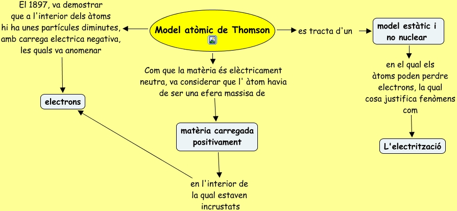 Este mapa conceptual tiene información relacionada a: Model atomic de thomson, Model atòmic de Thomson Com que la matèria és elèctricament neutra, va considerar que l' àtom havia de ser una efera massisa de matèria carregada positivament, Model atòmic de Thomson El 1897, va demostrar que a l'interior dels àtoms hi ha unes partícules diminutes, amb carrega electrica negativa, les quals va anomenar electrons, model estàtic i no nuclear en el qual els àtoms poden perdre electrons, la qual cosa justifica fenòmens com L'electrització, matèria carregada positivament en l'interior de la qual estaven incrustats electrons, Model atòmic de Thomson es tracta d'un model estàtic i no nuclear