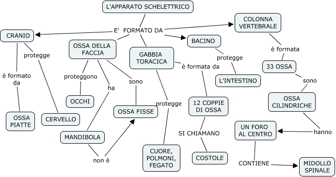 L' APPARATO SCHELETTRICO_VALENTINA, OSSA DELLA FACCIA sono OSSA FISSE, L'APPARATO SCHELETTRICO E' FORMATO DA GABBIA TORACICA, L'APPARATO SCHELETTRICO E' FORMATO DA OSSA DELLA FACCIA, GABBIA TORACICA protegge CUORE, POLMONI, FEGATO, L'APPARATO SCHELETTRICO E' FORMATO DA CRANIO, L'APPARATO SCHELETTRICO E' FORMATO DA COLONNA VERTEBRALE, CRANIO è formato da OSSA PIATTE, CRANIO protegge CERVELLO, GABBIA TORACICA è formata da 12 COPPIE DI OSSA, OSSA CILINDRICHE hanno UN FORO AL CENTRO