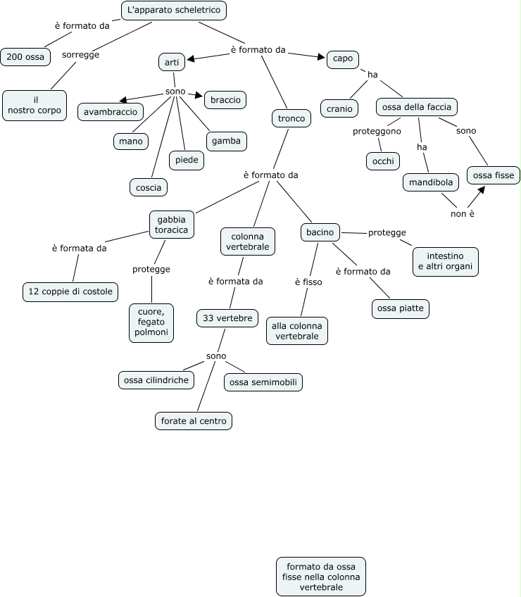 Questa Cmap, creata con IHMC CmapTools, contiene informazioni relative a: l'apparato scheletrico-camillo, mandibola non è ossa fisse, tronco è formato da bacino, bacino è fisso alla colonna vertebrale, ossa della faccia proteggono occhi, capo ha ossa della faccia, arti sono gamba, arti sono avambraccio, arti sono mano, capo ha cranio, L'apparato scheletrico è formato da 200 ossa, arti sono coscia, gabbia toracica è formata da 12 coppie di costole, gabbia toracica protegge cuore, fegato polmoni, bacino protegge intestino e altri organi, ossa della faccia ha mandibola, ossa della faccia sono ossa fisse, L'apparato scheletrico è formato da capo, colonna vertebrale è formata da 33 vertebre, L'apparato scheletrico è formato da arti, tronco è formato da colonna vertebrale