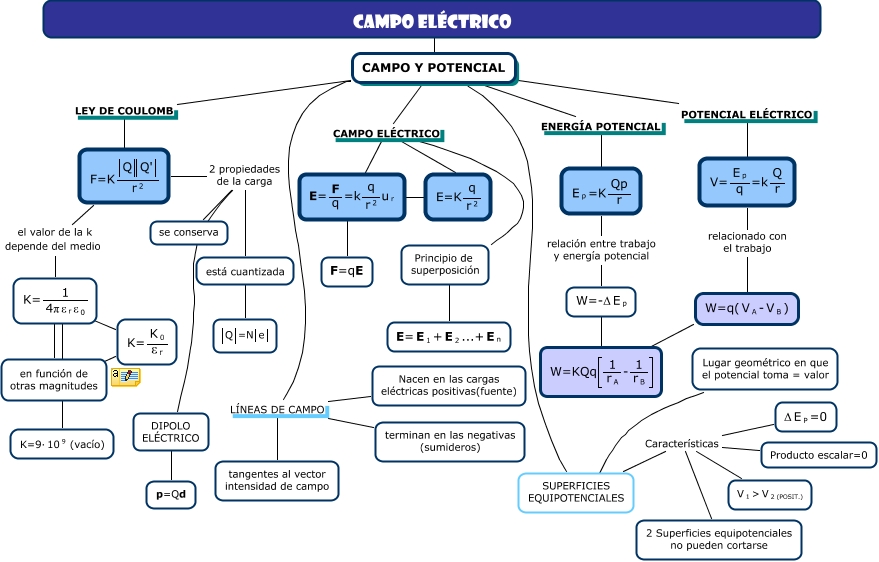 Este mapa conceptual tiene información relacionada a: campo eléctrico_naomi, <math xmlns="http://www.w3.org/1998/Math/MathML"> <mrow> <mtext> E= </mtext> <mfrac> <mtext> F </mtext> <mtext> q </mtext> </mfrac> <mtext> =k </mtext> <mfrac> <mtext> q </mtext> <mmultiscripts> <mtext> r </mtext> <none/> <mtext> 2 </mtext> </mmultiscripts> </mfrac> <mmultiscripts> <mtext> u </mtext> <mtext> r </mtext> <none/> </mmultiscripts> </mrow> </math> ???? F=qE, CAMPO Y POTENCIAL ???? SUPERFICIES EQUIPOTENCIALES, <math xmlns="http://www.w3.org/1998/Math/MathML"> <mrow> <mtext> E= </mtext> <mfrac> <mtext> F </mtext> <mtext> q </mtext> </mfrac> <mtext> =k </mtext> <mfrac> <mtext> q </mtext> <mmultiscripts> <mtext> r </mtext> <none/> <mtext> 2 </mtext> </mmultiscripts> </mfrac> <mmultiscripts> <mtext> u </mtext> <mtext> r </mtext> <none/> </mmultiscripts> </mrow> </math> ???? <math xmlns="http://www.w3.org/1998/Math/MathML"> <mrow> <mtext> E=K </mtext> <mfrac> <mtext> q </mtext> <mmultiscripts> <mtext> r </mtext> <none/> <mtext> 2 </mtext> </mmultiscripts> </mfrac> </mrow> </math>, SUPERFICIES EQUIPOTENCIALES ???? Lugar geométrico en que el potencial toma = valor, <math xmlns="http://www.w3.org/1998/Math/MathML"> <mrow> <mtext> V= </mtext> <mfrac> <mmultiscripts> <mtext> E </mtext> <mtext> p </mtext> <none/> </mmultiscripts> <mtext> q </mtext> </mfrac> <mtext> =k </mtext> <mfrac> <mtext> Q </mtext> <mtext> r </mtext> </mfrac> </mrow> </math> relacionado con el trabajo <math xmlns="http://www.w3.org/1998/Math/MathML"> <mrow> <mtext> W=q( </mtext> <mmultiscripts> <mtext> V </mtext> <mtext> A </mtext> <none/> </mmultiscripts> <mtext> - </mtext> <mmultiscripts> <mtext> V </mtext> <mtext> B </mtext> <none/> </mmultiscripts> <mtext> ) </mtext> </mrow> </math>, <math xmlns="http://www.w3.org/1998/Math/MathML"> <mrow> <mtext> W=-Δ </mtext> <mmultiscripts> <mtext> E </mtext> <mtext> p </mtext> <none/> </mmultiscripts> </mrow> </math> ???? <math xmlns="http://www.w3.org/1998/Math/MathML"> <mrow> <mtext> W=KQq </mtext> <mfenced open="[" close="]"> <mfrac> <mtext> 1 </mtext> <mmultiscripts> <mtext> r </mtext> <mtext> A </mtext> <none/> </mmultiscripts> </mfrac> <mtext> - </mtext> <mfrac> <mtext> 1 </mtext> <mmultiscripts> <mtext> r </mtext> <mtext> B </mtext> <none/> </mmultiscripts> </mfrac> </mfenced> </mrow> </math>, <math xmlns="http://www.w3.org/1998/Math/MathML"> <mrow> <mtext> K= </mtext> <mfrac> <mtext> 1 </mtext> <mrow> <mtext> 4π </mtext> <mmultiscripts> <mtext> ε </mtext> <mtext> r </mtext> <none/> </mmultiscripts> <mmultiscripts> <mtext> ε </mtext> <mtext> 0 </mtext> <none/> </mmultiscripts> </mrow> </mfrac> </mrow> </math> ???? <math xmlns="http://www.w3.org/1998/Math/MathML"> <mrow> <mtext> K=9· </mtext> <mmultiscripts> <mtext> 10 </mtext> <none/> <mtext> 9 </mtext> </mmultiscripts> <mtext> (vacío) </mtext> </mrow> </math>, <math xmlns="http://www.w3.org/1998/Math/MathML"> <mrow> <mtext> K= </mtext> <mfrac> <mtext> 1 </mtext> <mrow> <mtext> 4π </mtext> <mmultiscripts> <mtext> ε </mtext> <mtext> r </mtext> <none/> </mmultiscripts> <mmultiscripts> <mtext> ε </mtext> <mtext> 0 </mtext> <none/> </mmultiscripts> </mrow> </mfrac> </mrow> </math> ???? <math xmlns="http://www.w3.org/1998/Math/MathML"> <mrow> <mtext> K= </mtext> <mfrac> <mmultiscripts> <mtext> K </mtext> <mtext> 0 </mtext> <none/> </mmultiscripts> <mmultiscripts> <mtext> ε </mtext> <mtext> r </mtext> <none/> </mmultiscripts> </mfrac> </mrow> </math>, SUPERFICIES EQUIPOTENCIALES Características Producto escalar=0, CAMPO Y POTENCIAL CAMPO ELÉCTRICO <math xmlns="http://www.w3.org/1998/Math/MathML"> <mrow> <mtext> E= </mtext> <mfrac> <mtext> F </mtext> <mtext> q </mtext> </mfrac> <mtext> =k </mtext> <mfrac> <mtext> q </mtext> <mmultiscripts> <mtext> r </mtext> <none/> <mtext> 2 </mtext> </mmultiscripts> </mfrac> <mmultiscripts> <mtext> u </mtext> <mtext> r </mtext> <none/> </mmultiscripts> </mrow> </math>, CAMPO ELÉCTRICO ???? CAMPO Y POTENCIAL, <math xmlns="http://www.w3.org/1998/Math/MathML"> <mrow> <mtext> F=K </mtext> <mfrac> <mrow> <mfenced open="|" close="|"> <mtext> Q </mtext> </mfenced> <mfenced open="|" close="|"> <mtext> Q' </mtext> </mfenced> </mrow> <mmultiscripts> <mtext> r </mtext> <none/> <mtext> 2 </mtext> </mmultiscripts> </mfrac> </mrow> </math> 2 propiedades de la carga está cuantizada, <math xmlns="http://www.w3.org/1998/Math/MathML"> <mrow> <mtext> F=K </mtext> <mfrac> <mrow> <mfenced open="|" close="|"> <mtext> Q </mtext> </mfenced> <mfenced open="|" close="|"> <mtext> Q' </mtext> </mfenced> </mrow> <mmultiscripts> <mtext> r </mtext> <none/> <mtext> 2 </mtext> </mmultiscripts> </mfrac> </mrow> </math> 2 propiedades de la carga se conserva, CAMPO Y POTENCIAL LEY DE COULOMB <math xmlns="http://www.w3.org/1998/Math/MathML"> <mrow> <mtext> F=K </mtext> <mfrac> <mrow> <mfenced open="|" close="|"> <mtext> Q </mtext> </mfenced> <mfenced open="|" close="|"> <mtext> Q' </mtext> </mfenced> </mrow> <mmultiscripts> <mtext> r </mtext> <none/> <mtext> 2 </mtext> </mmultiscripts> </mfrac> </mrow> </math>, CAMPO Y POTENCIAL LÍNEAS DE CAMPO Nacen en las cargas eléctricas positivas(fuente), <math xmlns="http://www.w3.org/1998/Math/MathML"> <mrow> <mmultiscripts> <mtext> E </mtext> <mtext> p </mtext> <none/> </mmultiscripts> <mtext> =K </mtext> <mfrac> <mtext> Qp </mtext> <mtext> r </mtext> </mfrac> </mrow> </math> relación entre trabajo y energía potencial <math xmlns="http://www.w3.org/1998/Math/MathML"> <mrow> <mtext> W=-Δ </mtext> <mmultiscripts> <mtext> E </mtext> <mtext> p </mtext> <none/> </mmultiscripts> </mrow> </math>, <math xmlns="http://www.w3.org/1998/Math/MathML"> <mrow> <mtext> F=K </mtext> <mfrac> <mrow> <mfenced open="|" close="|"> <mtext> Q </mtext> </mfenced> <mfenced open="|" close="|"> <mtext> Q' </mtext> </mfenced> </mrow> <mmultiscripts> <mtext> r </mtext> <none/> <mtext> 2 </mtext> </mmultiscripts> </mfrac> </mrow> </math> 2 propiedades de la carga DIPOLO ELÉCTRICO, CAMPO Y POTENCIAL POTENCIAL ELÉCTRI