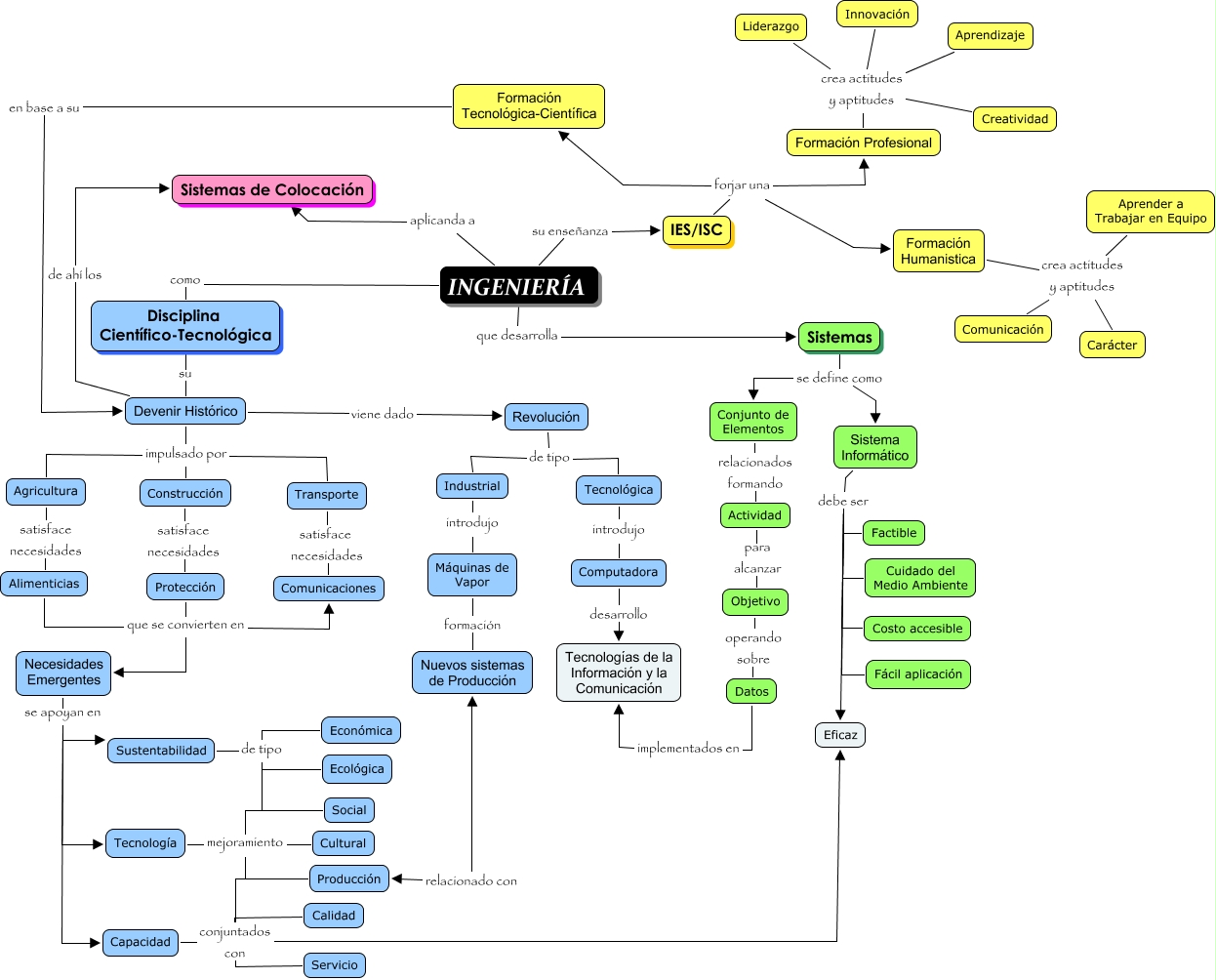 Este Cmap, tiene información relacionada con: I E y S, Protección que se convierten en Necesidades Emergentes, INGENIERÍA aplicanda a Sistemas de Colocación, INGENIERÍA que desarrolla Sistemas, Sistemas se define como Sistema Informático, Datos implementados en Tecnologías de la Información y la Comunicación, Alimenticias que se convierten en Comunicaciones, Formación Humanistica crea actitudes y aptitudes Carácter, Devenir Histórico impulsado por Construcción, Cuidado del Medio Ambiente debe ser Eficaz, Revolución de tipo Industrial, Construcción satisface necesidades Protección, Necesidades Emergentes se apoyan en Tecnología, Capacidad conjuntados con Eficaz, Necesidades Emergentes se apoyan en Capacidad, IES/ISC forjar una Formación Tecnológica-Científica, Fácil aplicación debe ser Eficaz, Sistemas se define como Conjunto de Elementos, Comunicación crea actitudes y aptitudes Carácter, Agricultura satisface necesidades Alimenticias, IES/ISC forjar una Formación Profesional
