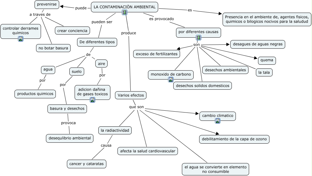 Este mapa conceptual tiene información relacionada a: CONTAMINACION GAMALIEL, la radiactividad causa cancer y cataratas, LA CONTAMINACIÒN AMBIENTAL es Presencia en el ambiente de, agentes fisicos, quimicos o bilogicos nocivos para la saludud, Varios efectos que son el agua se convierte en elemento no consumible, De diferentes tipos de agua, Varios efectos que son la radiactividad, aire por adicion dañina de gases toxicos, agua por productos quimicos, Varios efectos que son cambio climatico, suelo por basura y desechos, por diferentes causas son desagues de aguas negras, De diferentes tipos de aire, por diferentes causas son monoxido de carbono, por diferentes causas son la tala, De diferentes tipos de suelo, por diferentes causas son quema, basura y desechos provoca desequlibrio ambiental, Varios efectos que son debilitamiento de la capa de ozono, prevenirse a traves de no botar basura, prevenirse a traves de controlar derrames quimicos, LA CONTAMINACIÒN AMBIENTAL es provocado por diferentes causas