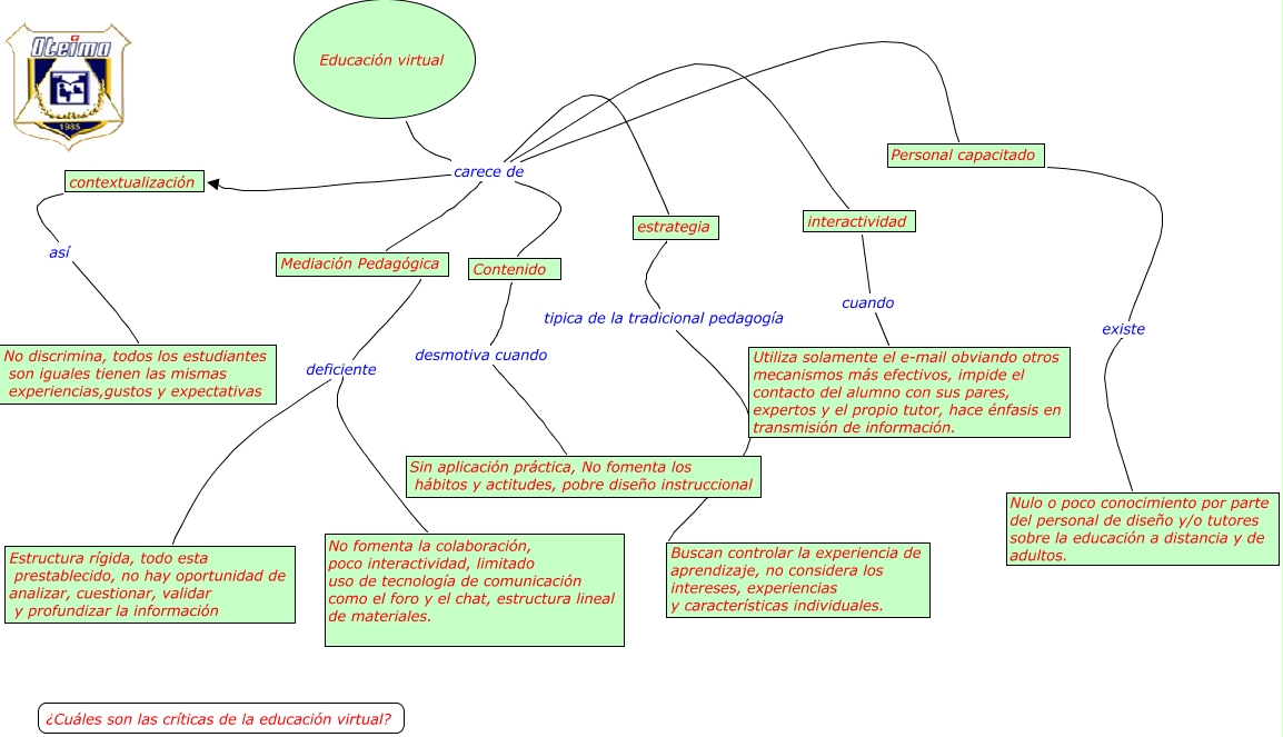 CRITICAS A LA EDUCACIÓN VIRTUAL, Educación virtual carece de interactividad, Mediación Pedagógica deficiente No fomenta la colaboración, poco interactividad, limitado uso de tecnología de comunicación como el foro y el chat, estructura lineal de materiales., Personal capacitado existe Nulo o poco conocimiento por parte del personal de diseño y/o tutores sobre la educación a distancia y de adultos., estrategia tipica de la tradicional pedagogía Buscan controlar la experiencia de aprendizaje, no considera los intereses, experiencias y características individuales., Mediación Pedagógica deficiente Estructura rígida, todo esta prestablecido, no hay oportunidad de analizar, cuestionar, validar y profundizar la información, Educación virtual carece de Mediación Pedagógica, contextualización así No discrimina, todos los estudiantes son iguales tienen las mismas experiencias,gustos y expectativas, Contenido desmotiva cuando Sin aplicación práctica, No fomenta los hábitos y actitudes, pobre diseño instruccional, Educación virtual carece de contextualización, Educación virtual carece de Contenido