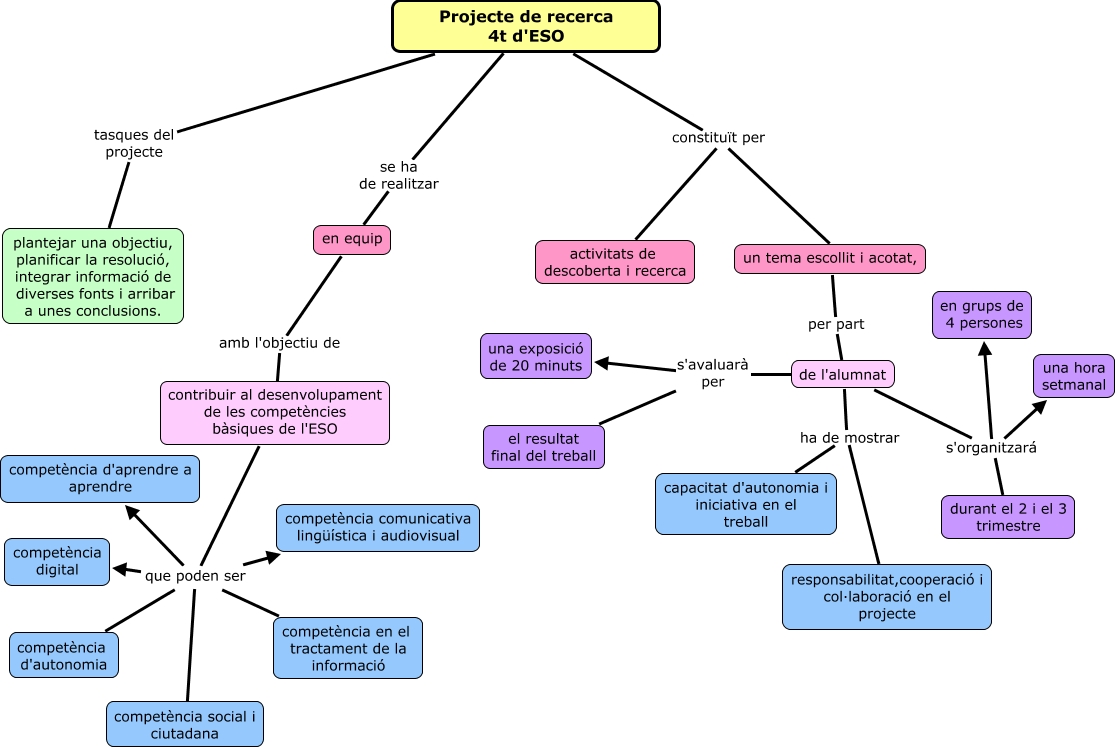 Este Cmap, tiene información relacionada con: Projecte de recerca 4t ESO M.C.S, en equip amb l'objectiu de contribuir al desenvolupament de les competències bàsiques de l'ESO, contribuir al desenvolupament de les competències bàsiques de l'ESO que poden ser competència digital, un tema escollit i acotat, per part de l'alumnat, contribuir al desenvolupament de les competències bàsiques de l'ESO que poden ser competència en el tractament de la informació, Projecte de recerca 4t d'ESO tasques del projecte plantejar una objectiu, planificar la resolució, integrar informació de diverses fonts i arribar a unes conclusions., de l'alumnat s'avaluarà per una exposició de 20 minuts, de l'alumnat s'organitzará en grups de 4 persones, de l'alumnat s'organitzará durant el 2 i el 3 trimestre, contribuir al desenvolupament de les competències bàsiques de l'ESO que poden ser competència social i ciutadana, Projecte de recerca 4t d'ESO constituït per activitats de descoberta i recerca, de l'alumnat s'organitzará una hora setmanal, Projecte de recerca 4t d'ESO se ha de realitzar en equip, de l'alumnat s'avaluarà per el resultat final del treball, de l'alumnat ha de mostrar responsabilitat,cooperació i col·laboració en el projecte, contribuir al desenvolupament de les competències bàsiques de l'ESO que poden ser competència comunicativa lingüística i audiovisual, Projecte de recerca 4t d'ESO constituït per un tema escollit i acotat,, contribuir al desenvolupament de les competències bàsiques de l'ESO que poden ser competència d'aprendre a aprendre, de l'alumnat ha de mostrar capacitat d'autonomia i iniciativa en el treball, contribuir al desenvolupament de les competències bàsiques de l'ESO que poden ser competència d'autonomia