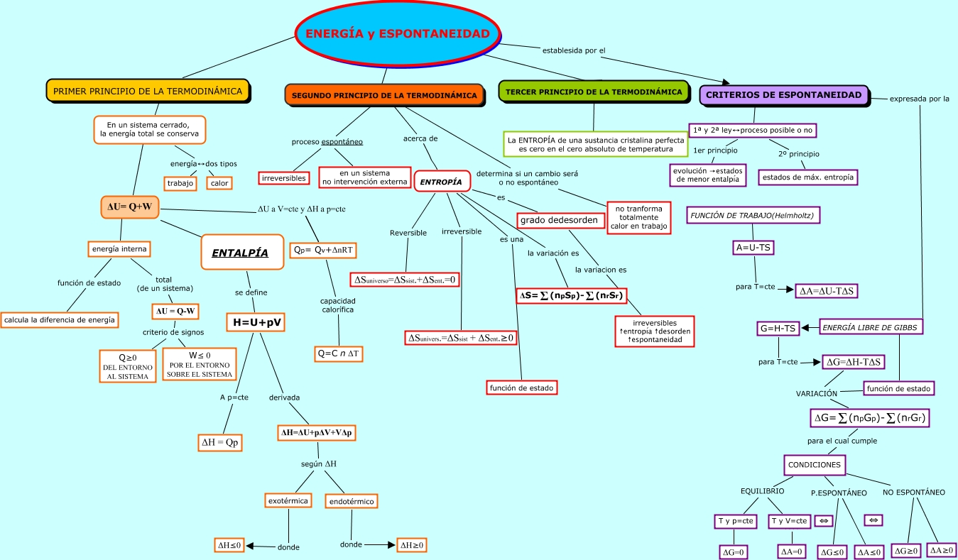 Este Cmap, tiene información relacionada con: Energia y Espontaniedad, En un sistema cerrado, la energía total se conserva ???? ΔU= Q+W, ΔU= Q+W ΔU a V=cte y ΔH a p=cte Qp= Qv+ΔnRT, ENTROPÍA es una función de estado, ΔH=ΔU+pΔV+VΔp según ΔH exotérmica, En un sistema cerrado, la energía total se conserva energía↔dos tipos trabajo, CONDICIONES NO ESPONTÁNEO ΔG≥0, energía interna función de estado calcula la diferencia de energía, G=H-TS para T=cte ΔG=ΔH-TΔS, ENERGÍA y ESPONTANEIDAD ???? SEGUNDO PRINCIPIO DE LA TERMODINÁMICA, ENTROPÍA es grado dedesorden, En un sistema cerrado, la energía total se conserva energía↔dos tipos calor, TERCER PRINCIPIO DE LA TERMODINÁMICA ???? La ENTROPÍA de una sustancia cristalina perfecta es cero en el cero absoluto de temperatura, ΔU = Q-W criterio de signos Q≥0 DEL ENTORNO AL SISTEMA, ENTROPÍA Reversible ΔSuniverso=ΔSsist.+ΔSent.=0, CONDICIONES P.ESPONTÁNEO ΔG≤0, ΔU= Q+W ???? ENTALPÍA, ΔH=ΔU+pΔV+VΔp según ΔH endotérmico, SEGUNDO PRINCIPIO DE LA TERMODINÁMICA acerca de ENTROPÍA, ΔU= Q+W ΔU a V=cte y ΔH a p=cte Qp= Qv+ΔnRT, A=U-TS para T=cte ΔA=ΔU-TΔS