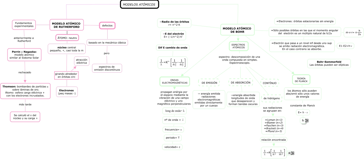 En el caso contrario se absorbe. </mtext> </math> <math xmlns="http://www.w3.org/1998/Math/MathML"> <mtext> E1-E2=h·ν </mtext> </math>, basado en la mecánica clásica pero espectros de emisión discontínuos, Perrin y Nagaoka: modelo atómico similar al Sistema Solar rechazado Thomson: bombardeo de partíclas α sobre láminas de oro. Átomo: esfera carga eléctrica + con los electrones incrustados., CONTÍNUO espectro: descomposición de una onda compuesta en simples. Espectroescopio., <math xmlns="http://www.w3.org/1998/Math/MathML"> <mrow> <mtext> →E del electrón