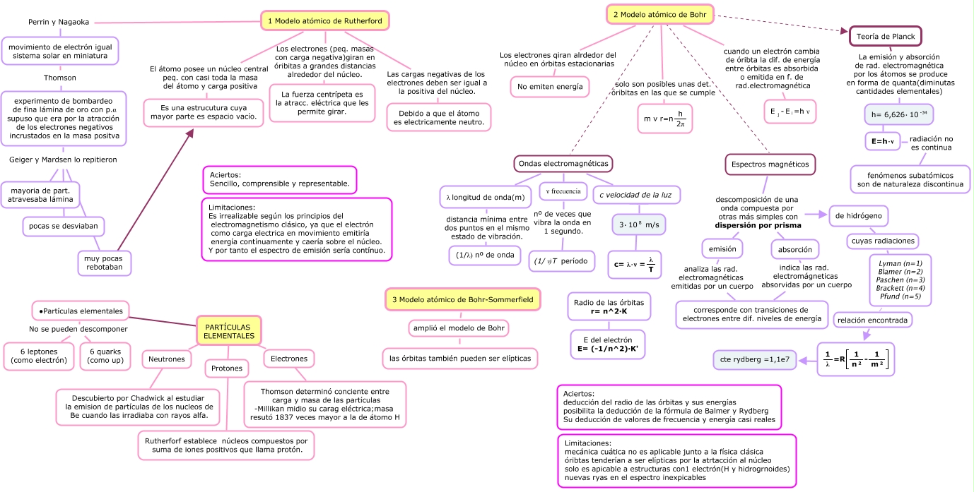 Este Cmap, tiene información relacionada con: Modelos atómicos, Claudia Schneegluth, muy pocas rebotaban ???? Es una estrucutura cuya mayor parte es espacio vacío., emisión analiza las rad. electromagnéticas emitidas por un cuerpo corresponde con transiciones de electrones entre dif. niveles de energía, PARTÍCULAS ELEMENTALES ???? ∙Partículas elementales, 1 Modelo atómico de Rutherford Perrin y Nagaoka movimiento de electrón igual sistema solar en miniatura, 2 Modelo atómico de Bohr ???? Teoría de Planck, 2 Modelo atómico de Bohr Ondas electromagnéticas ν frecuencia, Teoría de Planck La emisión y absorción de rad. electromagnética por los átomos se produce en forma de quanta(diminutas cantidades elementales) <math xmlns="http://www.w3.org/1998/Math/MathML"> <mrow> <mtext> h= 6,626⋅ </mtext> <mmultiscripts> <mtext> 10 </mtext> <none/> <mtext> -34 </mtext> </mmultiscripts> </mrow> </math>, Protones ???? Rutherforf establece núcleos compuestos por suma de iones positivos que llama protón., Neutrones ???? Descubierto por Chadwick al estudiar la emision de partículas de los nucleos de Be cuando las irradiaba con rayos alfa., experimento de bombardeo de fina lámina de oro con p.α supuso que era por la atracción de los electrones negativos incrustados en la masa positva Geiger y Mardsen lo repitieron mayoria de part. atravesaba lámina, absorción indica las rad. electromágneticas absorvidas por un cuerpo corresponde con transiciones de electrones entre dif. niveles de energía, <math xmlns="http://www.w3.org/1998/Math/MathML"> <mrow> <mtext> E del electrón
