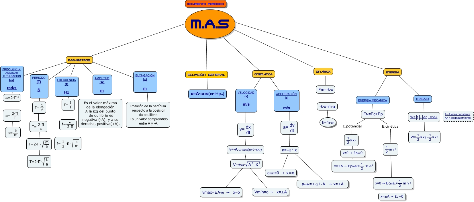 Este Cmap, tiene información relacionada con: TEMA1- MAS.Sofía, <math xmlns="http://www.w3.org/1998/Math/MathML"> <mrow> <mtext> f= </mtext> <mfrac> <mtext> 1 </mtext> <mtext> T </mtext> </mfrac> </mrow> </math> ???? <math xmlns="http://www.w3.org/1998/Math/MathML"> <mrow> <mtext> f= </mtext> <mfrac> <mtext> ω </mtext> <mtext> 2·∏ </mtext> </mfrac> </mrow> </math>, M.A.S ???? ECUACIÓN GENERAL, TRABAJO ???? <math xmlns="http://www.w3.org/1998/Math/MathML"> <mrow> <mtext> W= </mtext> <mfenced open="|" close="|"> <mtext> f </mtext> </mfenced> <mtext> ⋅ </mtext> <mfenced open="|" close="|"> <mtext> Ar </mtext> </mfenced> <mtext> ⋅cosα </mtext> </mrow> </math>, x=0 → Ep=0 ???? <math xmlns="http://www.w3.org/1998/Math/MathML"> <mrow> <mtext> x=±A → Epmáx= </mtext> <mfrac> <mtext> 1 </mtext> <mtext> 2 </mtext> </mfrac> <mtext> ·k· </mtext> <mmultiscripts> <mtext> A </mtext> <none/> <mtext> 2 </mtext> </mmultiscripts> </mrow> </math>, DINÁMICA ???? Fm=-k·x, PARÁMETROS ???? FRECUENCIA ANGULAR O PULSACIÓN (ω) rad/s, PARÁMETROS ???? AMPLITUD (A) m, <math xmlns="http://www.w3.org/1998/Math/MathML"> <mrow> <mtext> T= </mtext> <mfrac> <mtext> 1 </mtext> <mtext> f </mtext> </mfrac> </mrow> </math> ???? <math xmlns="http://www.w3.org/1998/Math/MathML"> <mrow> <mtext> T= </mtext> <mfrac> <mtext> 2·∏ </mtext> <mtext> ω </mtext> </mfrac> </mrow> </math>, <math xmlns="http://www.w3.org/1998/Math/MathML"> <mrow> <mtext> a=- </mtext> <mmultiscripts> <mtext> ω </mtext> <none/> <mtext> 2 </mtext> </mmultiscripts> <mtext> ·x </mtext> </mrow> </math> ???? <math xmlns="http://www.w3.org/1998/Math/MathML"> <mrow> <mtext> amáx=± </mtext> <mmultiscripts> <mtext> ω </mtext> <none/> <mtext> 2 </mtext> </mmultiscripts> <mtext> ⋅A → x=±A </mtext> </mrow> </math>, M.A.S ???? DINÁMICA, ENERGÍA MECÁNICA ???? EM=Ec+Ep, PERIODO (T) S ???? <math xmlns="http://www.w3.org/1998/Math/MathML"> <mrow> <mtext> T= </mtext> <mfrac> <mtext> 1 </mtext> <mtext> f </mtext> </mfrac> </mrow> </math>, EM=Ec+Ep E.cinética <math xmlns="http://www.w3.org/1998/Math/MathML"> <mrow> <mfrac> <mtext> 1 </mtext> <mtext> 2 </mtext> </mfrac> <mtext> m </mtext> <mmultiscripts> <mtext> v </mtext> <none/> <mtext> 2 </mtext> </mmultiscripts> </mrow> </math>, Fm=-k·x ???? -k·x=m·a, M.A.S ???? ENERGÍA, M.A.S ???? PARÁMETROS, <math xmlns="http://www.w3.org/1998/Math/MathML"> <mrow> <mtext> T= </mtext> <mfrac> <mtext> 2·∏ </mtext> <mtext> ω </mtext> </mfrac> </mrow> </math> ???? <math xmlns="http://www.w3.org/1998/Math/MathML"> <mrow> <mtext> T=2·∏· </mtext> <msqrt> <mfrac> <mtext> m </mtext> <mtext> k </mtext> </mfrac> </msqrt> </mrow> </math>, FRECUENCIA (f) Hz ???? <math xmlns="http://www.w3.org/1998/Math/MathML"> <mrow> <mtext> f= </mtext> <mfrac> <mtext> 1 </mtext> <mtext> T </mtext> </mfrac> </mrow> </math>, <math xmlns="http://www.w3.org/1998/Math/MathML"> <mrow> <mtext> ω= </mtext> <mfrac> <mtext> 2·∏ </mtext> <mtext> T </mtext> </mfrac> </mrow> </math> ???? <math xmlns="http://www.w3.org/1998/Math/MathML"> <mrow> <mtext> ω= </mtext> <mfrac> <mtext> k </mtext> <mtext> m </mtext> </mfrac> </mrow> </math>, CINEMÁTICA ???? <math xmlns="http://www.w3.org/1998/Math/MathML"> <mrow> <mtext> VELOCIDAD