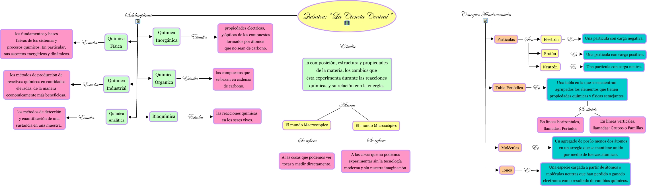 Este Cmap, tiene información relacionada con: La ciencia central, Química Analítica Estudia los métodos de detección y cuantificación de una sustancia en una muestra., Química:"La Ciencia Central" Subdisciplinas Química Física, Química Industrial Estudia los métodos de producción de reactivos químicos en cantidades elevadas, de la manera económicamente más beneficiosa., Iones Es Una especie cargada a partir de átomos o moléculas neutras que han perdido o ganado electrones como resultado de cambios químicos., Química Inorgánica Estudia propiedades eléctricas, y ópticas de los compuestos formados por átomos que no sean de carbono., Bioquímica Estudia las reacciones químicas en los seres vivos., Química:"La Ciencia Central" Estudia la composición, estructura y propiedades de la materia, los cambios que ésta experimenta durante las reacciones químicas y su relación con la energía., Partículas Son Neutrón, Protón Es Una particula con carga positiva., Química:"La Ciencia Central" Conceptos Fundamentales Iones, Química:"La Ciencia Central" Conceptos Fundamentales Tabla Periódica, El mundo Microscópico Se refiere A las cosas que no podemos experimentar sin la tecnología moderna y sin nuestra imaginación., Moléculas Es Un agregado de por lo menos dos átomos en un arreglo que se mantiene unido por medio de fuerzas atómicas., Química:"La Ciencia Central" Subdisciplinas Química Orgánica, Neutrón Es Una partícula con carga neutra., Química:"La Ciencia Central" Subdisciplinas Química Inorgánica, Química:"La Ciencia Central" Subdisciplinas Química Analítica, Tabla Periódica Es Una tabla en la que se encuentran agrupados los elementos que tienen propiedades químicas y físicas semejantes., Química:"La Ciencia Central" Conceptos Fundamentales Partículas, la composición, estructura y propiedades de la materia, los cambios que ésta experimenta durante las reacciones químicas y su relación con la energía. Abarca El mundo Macroscópico