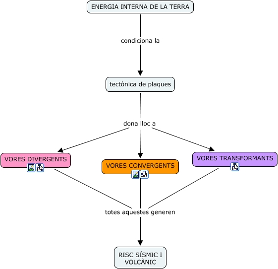 energia interna de la Terra, ENERGIA INTERNA DE LA TERRA condiciona la tectònica de plaques, tectònica de plaques dona lloc a VORES DIVERGENTS, tectònica de plaques dona lloc a VORES CONVERGENTS, tectònica de plaques dona lloc a VORES TRANSFORMANTS, VORES DIVERGENTS totes aquestes generen RISC SÍSMIC I VOLCÀNIC, VORES TRANSFORMANTS totes aquestes generen RISC SÍSMIC I VOLCÀNIC, VORES CONVERGENTS totes aquestes generen RISC SÍSMIC I VOLCÀNIC
