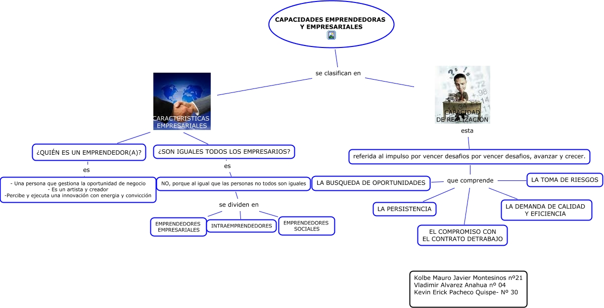 Este Cmap, tiene información relacionada con: Emprendedores_kolbe_kevin _vlady, CAPACIDADES EMPRENDEDORAS Y EMPRESARIALES se clasifican en CARACTERISTICAS EMPRESARIALES, CAPACIDADES EMPRENDEDORAS Y EMPRESARIALES se clasifican en CAPACIDAD DE REALIZACIÓN, referida al impulso por vencer desafios por vencer desafios, avanzar y crecer. que comprende EL COMPROMISO CON EL CONTRATO DETRABAJO, referida al impulso por vencer desafios por vencer desafios, avanzar y crecer. que comprende LA BUSQUEDA DE OPORTUNIDADES, ¿SON IGUALES TODOS LOS EMPRESARIOS? es NO, porque al igual que las personas no todos son iguales, referida al impulso por vencer desafios por vencer desafios, avanzar y crecer. que comprende LA TOMA DE RIESGOS, NO, porque al igual que las personas no todos son iguales se dividen en INTRAEMPRENDEDORES, CARACTERISTICAS EMPRESARIALES ???? ¿QUIÉN ES UN EMPRENDEDOR(A)?, NO, porque al igual que las personas no todos son iguales se dividen en EMPRENDEDORES EMPRESARIALES, CAPACIDAD DE REALIZACIÓN esta referida al impulso por vencer desafios por vencer desafios, avanzar y crecer., CARACTERISTICAS EMPRESARIALES ???? ¿SON IGUALES TODOS LOS EMPRESARIOS?, referida al impulso por vencer desafios por vencer desafios, avanzar y crecer. que comprende LA PERSISTENCIA, referida al impulso por vencer desafios por vencer desafios, avanzar y crecer. que comprende LA DEMANDA DE CALIDAD Y EFICIENCIA, NO, porque al igual que las personas no todos son iguales se dividen en EMPRENDEDORES SOCIALES
