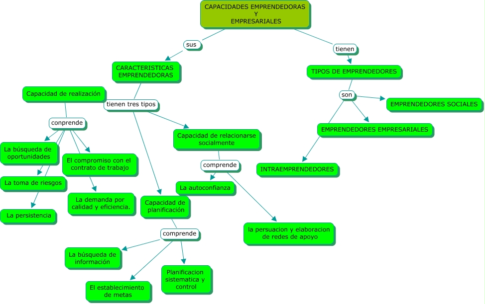 Este Cmap, tiene información relacionada con: Emprendeores_ Luz _Jhailyn_ Aracely, Capacidad de realización conprende La búsqueda de oportunidades, CAPACIDADES EMPRENDEDORAS Y EMPRESARIALES sus CARACTERISTICAS EMPRENDEDORAS, Capacidad de realización conprende La toma de riesgos, TIPOS DE EMPRENDEDORES son EMPRENDEDORES EMPRESARIALES, Capacidad de relacionarse socialmente comprende La autoconfianza, Capacidad de realización conprende El compromiso con el contrato de trabajo, CARACTERISTICAS EMPRENDEDORAS tienen tres tipos Capacidad de planificación, Capacidad de realización conprende La demanda por calidad y eficiencia., Capacidad de realización conprende La persistencia, Capacidad de planificación comprende La búsqueda de información, Capacidad de planificación comprende El establecimiento de metas, Capacidad de relacionarse socialmente comprende la persuacion y elaboracion de redes de apoyo, TIPOS DE EMPRENDEDORES son EMPRENDEDORES SOCIALES, Capacidad de planificación comprende Planificacion sistematica y control, CARACTERISTICAS EMPRENDEDORAS tienen tres tipos Capacidad de relacionarse socialmente, CARACTERISTICAS EMPRENDEDORAS tienen tres tipos Capacidad de realización, TIPOS DE EMPRENDEDORES son INTRAEMPRENDEDORES, CAPACIDADES EMPRENDEDORAS Y EMPRESARIALES tienen TIPOS DE EMPRENDEDORES