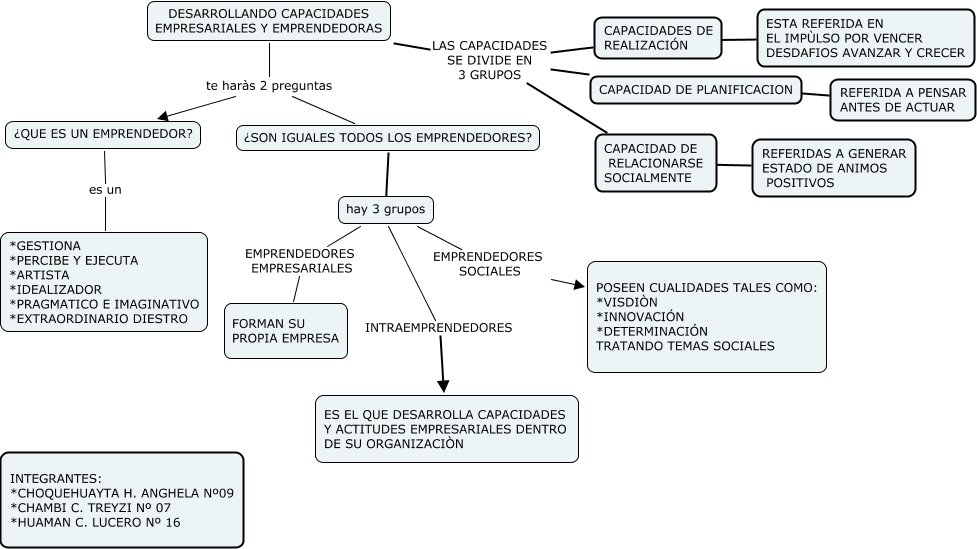 Este Cmap, tiene información relacionada con: EMPRENDEDORES_Treyzi, Anghela,Lucero, CAPACIDAD DE RELACIONARSE SOCIALMENTE ???? REFERIDAS A GENERAR ESTADO DE ANIMOS POSITIVOS, DESARROLLANDO CAPACIDADES EMPRESARIALES Y EMPRENDEDORAS LAS CAPACIDADES SE DIVIDE EN 3 GRUPOS CAPACIDADES DE REALIZACIÓN, hay 3 grupos ???? ¿SON IGUALES TODOS LOS EMPRENDEDORES?, DESARROLLANDO CAPACIDADES EMPRESARIALES Y EMPRENDEDORAS te haràs 2 preguntas ¿QUE ES UN EMPRENDEDOR?, DESARROLLANDO CAPACIDADES EMPRESARIALES Y EMPRENDEDORAS te haràs 2 preguntas ¿SON IGUALES TODOS LOS EMPRENDEDORES?, ¿QUE ES UN EMPRENDEDOR? es un *GESTIONA *PERCIBE Y EJECUTA *ARTISTA *IDEALIZADOR *PRAGMATICO E IMAGINATIVO *EXTRAORDINARIO DIESTRO, hay 3 grupos EMPRENDEDORES EMPRESARIALES FORMAN SU PROPIA EMPRESA, DESARROLLANDO CAPACIDADES EMPRESARIALES Y EMPRENDEDORAS LAS CAPACIDADES SE DIVIDE EN 3 GRUPOS CAPACIDAD DE RELACIONARSE SOCIALMENTE, DESARROLLANDO CAPACIDADES EMPRESARIALES Y EMPRENDEDORAS LAS CAPACIDADES SE DIVIDE EN 3 GRUPOS CAPACIDAD DE PLANIFICACION, CAPACIDADES DE REALIZACIÓN ???? ESTA REFERIDA EN EL IMPÙLSO POR VENCER DESDAFIOS AVANZAR Y CRECER, hay 3 grupos EMPRENDEDORES SOCIALES POSEEN CUALIDADES TALES COMO: *VISDIÒN *INNOVACIÓN *DETERMINACIÓN TRATANDO TEMAS SOCIALES, CAPACIDAD DE PLANIFICACION ???? REFERIDA A PENSAR ANTES DE ACTUAR