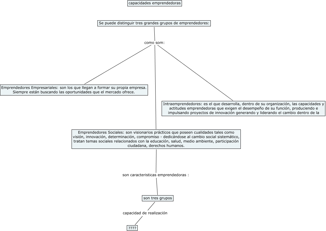 Este Cmap, tiene información relacionada con: emprendedores clareth, yobissa,ibeth, Se puede distinguir tres grandes grupos de emprendedores: como som: Intraemprendedores: es el que desarrolla, dentro de su organización, las capacidades y actitudes emprendedoras que exigen el desempeño de su función, produciendo e impulsando proyectos de innovación generando y liderando el cambio dentro de la, Se puede distinguir tres grandes grupos de emprendedores: como som: Emprendedores Empresariales: son los que llegan a formar su propia empresa. Siempre están buscando las oportunidades que el mercado ofrece., son tres grupos capacidad de realización ????, Emprendedores Sociales: son visionarios prácticos que poseen cualidades tales como visión, innovación, determinación, compromiso - dedicándose al cambio social sistemático, tratan temas sociales relacionados con la educación, salud, medio ambiente, participación ciudadana, derechos humanos. son caracteristicas emprendedoras : son tres grupos, Se puede distinguir tres grandes grupos de emprendedores: como som: Emprendedores Sociales: son visionarios prácticos que poseen cualidades tales como visión, innovación, determinación, compromiso - dedicándose al cambio social sistemático, tratan temas sociales relacionados con la educación, salud, medio ambiente, participación ciudadana, derechos humanos.