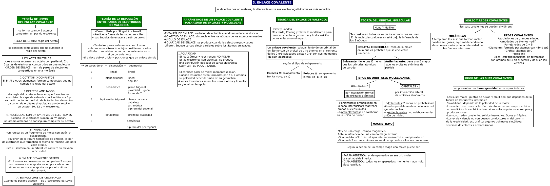 Este Cmap, tiene información relacionada con: enlac quim y prop de las sust 2, Lara Ferri, PARÁMETROS DE UN ENLACE COVALENTE POLARIDAD DE ENLACES Y MOLÉCULAS -ENTALPÍA DE ENLACE: variación de entalpía cuando un enlace se disocia -LONGITUD DE ENLACE: distancia entre los núcleos de los átomos enlazados -ÁNGULO DE ENLACE -POLARIDAD DE ENLACE: se produce cuando las electronegatividades difieren. Induce cargas eléctr parciales sobre los átomos enlazados., Un enlace covalente: solapamiento de un orbital de un átomo con un orbital de otro átomo: en el conjunto de los 2 orb solapados existen 2 e- con sus momentos de spin apareados según el tipo de solapamiento Enlaces π: solapamiento lateral (p+p, p+d), -Tanto los pares enlazantes como los no enlazantes se situan lo + lejos posible entre ellos -El efecto repulsivo de un par no enlazante es > al de un enlazante -El enlace doble/ triple = posiciones que un enlace simple nº de pares de e- -- disposición -- geometría 2 lineal lineal 3 plana trigonal lineal angular 4 tetraédrica plana trigonal piramidal trigonal forma de T 5 bipiramidal trigonal plana cuadrada caballete tetraédrica bipiramidal trigonal 6 octaédrica piramidal cuadrada 7 octaédrica 8 bipiramidal pentagonal, MAGNETISMO Mov de una carga: campo magnético. Ante la influencia de una campo magn externo: -Si un orbital sólo 1 e-: el spin interaccionará con el campo externo -Si un orb 2 e-: las acciones sobre el campo sobre ellos se compensan, REGLA DE LEWIS: regla del octeto -se conocen compuestos que no cumplen la regla del octeto 1.ENLACES MÚLTIPLES -Los átomos alcanzan su octeto compartiendo 2 o 3 pares de electrones compartidos en una molécula -ORDEN DE ENLACE: num de pares de electrones compartidos en una molécula, Hund Y Mulliken Se consideran todos los e- de los átomos que se unen. En la molécula cualquier e- está bajo la influencia de los 2 núcleos, 1.ENLACES MÚLTIPLES -Los átomos alcanzan su octeto compartiendo 2 o 3 pares de electrones compartidos en una molécula -ORDEN DE ENLACE: num de pares de electrones compartidos en una molécula 2.OCTETOS INCOMPLETOS El B, Al y otros elementos forman compuestos que no cumplen la regla del octeto, ORBITAL MOLECULAR: zona de la molec en la que es probable que se encuentre un det e- Enlazante: tiene una E menor que los orbitales atómicos de partida, Heiter y London Más tarde, Pauling y Slater la modificaron para tener en cuenta la geometría y la disposición de los enlaces en el espacio Un enlace covalente: solapamiento de un orbital de un átomo con un orbital de otro átomo: en el conjunto de los 2 orb solapados existen 2 e- con sus momentos de spin apareados, Un enlace covalente: solapamiento de un orbital de un átomo con un orbital de otro átomo: en el conjunto de los 2 orb solapados existen 2 e- con sus momentos de spin apareados según el tipo de solapamiento Enlaces σ: solapamiento frontal (s+s, s+p), 5. RADICALES -Un radical es un fragmento de molec con algún e- desapareado. -Provienen de la rotura homolítica de enlaces, el par de electrones que formaban el átomo se reparte uno para cada átomo. -Este e- solitario en un orbital les confiere su elevada reactividad 6.ENLACE COVALENTE DATIVO -En los enlaces covalentes se comparten 2 e- que normalmente son aportados un por cada atom. -A veces los dos son aportados por el = átomo. -Ion amonio, PROP DE LAS SUST COVALENTES no presentan una homogeneidad en sus propiedades, por interacción lateral de orbitales atmómicos -->Enlazantes:2 zonas de probabilidad situadas paralelamente a cada lado del eje internuclear -->Antienlazantes: no colaboran en la unión de núcleo, las sust covalentes se pueden dividir en: REDES COVALENTES Asociaciones de grandes e indet cantidades de átomos =/dif. Por ej: redes de C y Si -Diamante: formado por átomos con hibrid sp3 -Grafito: átomos de C -Futboleno -Sílice: estr tridimensional de tetraedros con átomos de Si en el centro y de O en los vértices, 6.ENLACE COVALENTE DATIVO -En los enlaces covalentes se comparten 2 e- que normalmente son aportados un por cada atom. -A veces los dos son aportados por el = átomo. -Ion amonio 7. ESTRUCTURAS DE RESONANCIA Cuando es posible escribir + de 1 estructura de Lewis. -Benceno, ORBITALES σ por interacción frontal de orbitales atómicos, ORBITAL MOLECULAR: zona de la molec en la que es probable que se encuentre un det e- Antienlazante: tiene una E mayor que los orbitales atómicos de partida, 3.OCTETOS AMPLIADOS -La regla del octeto se basa en que 8 electrones completan la capa de valencia con 1 orbital s y 3 p. -A partir del tercer período de la tabla, los elementos disponen de orbitales d vacíos, se puede ampliar su octeto: 10, 12 o + electrones. 4. MOLÉCULAS CON UN Nº IMPAR DE ELECTRONES Cuando los electrones suman un nº impar, un átomo almenos no conseguirá completar su octeto., 3. ENLACE COVALENTE se da entre dos no metales, la diferencia entre sus electronegatividades es más reducida, TIPOS DE ORBITALES MOLECULARES ORBITALES π