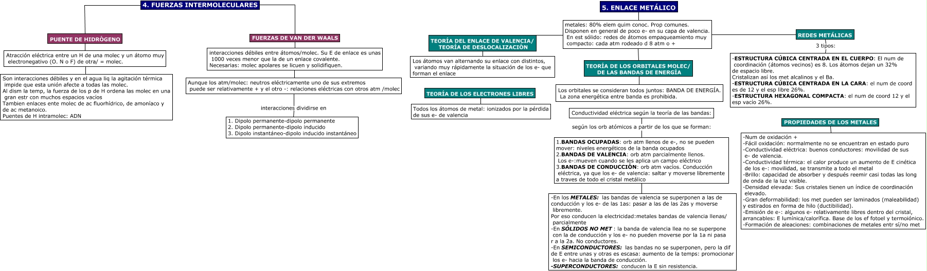 Este Cmap, tiene información relacionada con: enlac quim y prop de las sust 3, Lara Ferri, 1.BANDAS OCUPADAS: orb atm llenos de e-, no se pueden mover: niveles energéticos de la banda ocupados 2.BANDAS DE VALENCIA: orb atm parcialmente llenos. Los e-:mueven cuando se les aplica un campo eléctrico 3.BANDAS DE CONDUCCIÓN: orb atm vacíos. Conducción eléctrica, ya que los e- de valencia: saltar y moverse libremente a traves de todo el cristal metálico -En los METALES: las bandas de valencia se superponen a las de conducción y los e- de las 1as: pasar a las de las 2as y moverse libremente. Por eso conducen la electricidad:metales bandas de valencia llenas/ parcialmente -En SÓLIDOS NO MET: la banda de valencia llea no se superpone con la de conducción y los e- no pueden moverse por la 1a ni pasa r a la 2a. No conductores. -En SEMICONDUCTORES: las bandas no se superponen, pero la dif de E entre unas y otras es escasa: aumento de la temps: promocionar los e- hacia la banda de conducción. -SUPERCONDUCTORES: conducen la E sin resistencia., Atracción eléctrica entre un H de una molec y un átomo muy electronegativo (O. N o F) de otra/ = molec. Son interacciones débiles y en el agua liq la agitación térmica impide que esta unión afecte a todas las molec. Al dism la temp, la fuerza de los p de H ordena las molec en una gran estr con muchos espacios vacíos Tambien enlaces ente molec de ac fluorhídrico, de amoníaco y de ac metanoico. Puentes de H intramolec: ADN, PROPIEDADES DE LOS METALES -Num de oxidación + -Fácil oxidación: normalmente no se encuentran en estado puro -Conductividad eléctrica: buenos conductores: movilidad de sus e- de valencia. -Conductividad térmica: el calor produce un aumento de E cinética de los e-: movilidad, se transmite a todo el metal -Brillo: capacidad de absorber y después reemir casi todas las long de onda de la luz visible. -Densidad elevada: Sus cristales tienen un índice de coordinación elevado. -Gran deformabilidad: los met pueden ser laminados (maleabilidad) y estirados en forma de hilo (ductibilidad). -Emisión de e-: algunos e- relativamente libres dentro del cristal, arrancables: E lumínica/calorífica. Base de los ef fotoel y termoiónico. -Formación de aleaciones: combinaciones de metales entr sí/no met, interacciones débiles entre átomos/molec. Su E de enlace es unas 1000 veces menor que la de un enlace covalente. Necesarias: molec apolares se licuen y solidifiquen. Aunque los atm/molec: neutros eléctricamente uno de sus extremos puede ser relativamente + y el otro -: relaciones eléctricas con otros atm /molec, REDES METÁLICAS 3 tipos: -ESTRUCTURA CÚBICA CENTRADA EN EL CUERPO: El num de coordinación (átomos vecinos) es 8. Los átomos dejan un 32% de espacio libre. Cristalizan así los met alcalinos y el Ba. -ESTRUCTURA CÚBICA CENTRADA EN LA CARA: el num de coord es de 12 y el esp libre 26%. -ESTRUCTURA HEXAGONAL COMPACTA: el num de coord 12 y el esp vacío 26%., 4. FUERZAS INTERMOLECULARES FUERZAS DE VAN DER WAALS, Conductividad eléctrica según la teoría de las bandas: según los orb atómicos a partir de los que se forman: 1.BANDAS OCUPADAS: orb atm llenos de e-, no se pueden mover: niveles energéticos de la banda ocupados 2.BANDAS DE VALENCIA: orb atm parcialmente llenos. Los e-:mueven cuando se les aplica un campo eléctrico 3.BANDAS DE CONDUCCIÓN: orb atm vacíos. Conducción eléctrica, ya que los e- de valencia: saltar y moverse libremente a traves de todo el cristal metálico, metales: 80% elem quim conoc. Prop comunes. Disponen en general de poco e- en su capa de valencia. En est sólido: redes de átomos empaqueamiento muy compacto: cada atm rodeado d 8 atm o + TEORÍA DEL ENLACE DE VALENCIA/ TEORÍA DE DESLOCALIZACIÓN, 4. FUERZAS INTERMOLECULARES PUENTE DE HIDRÓGENO, Aunque los atm/molec: neutros eléctricamente uno de sus extremos puede ser relativamente + y el otro -: relaciones eléctricas con otros atm /molec interacciones dividirse en 1. Dipolo permanente-dipolo permanente 2. Dipolo permanente-dipolo inducido 3. Dipolo instantáneo-dipolo inducido instantáneo, PUENTE DE HIDRÓGENO Atracción eléctrica entre un H de una molec y un átomo muy electronegativo (O. N o F) de otra/ = molec., FUERZAS DE VAN DER WAALS interacciones débiles entre átomos/molec. Su E de enlace es unas 1000 veces menor que la de un enlace covalente. Necesarias: molec apolares se licuen y solidifiquen., metales: 80% elem quim conoc. Prop comunes. Disponen en general de poco e- en su capa de valencia. En est sólido: redes de átomos empaqueamiento muy compacto: cada atm rodeado d 8 atm o + TEORÍA DE LOS ORBITALES MOLEC/ DE LAS BANDAS DE ENERGÍA, TEORÍA DEL ENLACE DE VALENCIA/ TEORÍA DE DESLOCALIZACIÓN Los átomos van alternando su enlace con distintos, variando muy rápidamente la situación de los e- que forman el enlace, TEORÍA DE LOS ORBITALES MOLEC/ DE LAS BANDAS DE ENERGÍA Los orbitales se consideran todos juntos: BANDA DE ENERGÍA. La zona energética entre banda es prohibida., metales: 80% elem quim conoc. Prop comunes. Disponen en general de poco e- en su capa de valencia. En est sólido: redes de átomos empaqueamiento muy compacto: cada atm rodeado d 8 atm o + REDES METÁLICAS, TEORÍA DE LOS ELECTRONES LIBRES Todos los átomos de metal: ionizados por la pérdida de sus e- de valencia, 5. ENLACE METÁLICO metales: 80% elem quim conoc. Prop comunes. Disponen en general de poco e- en su capa de valencia. En est sólido: redes de átomos empaqueamiento muy compacto: cada atm rodeado d 8 atm o +