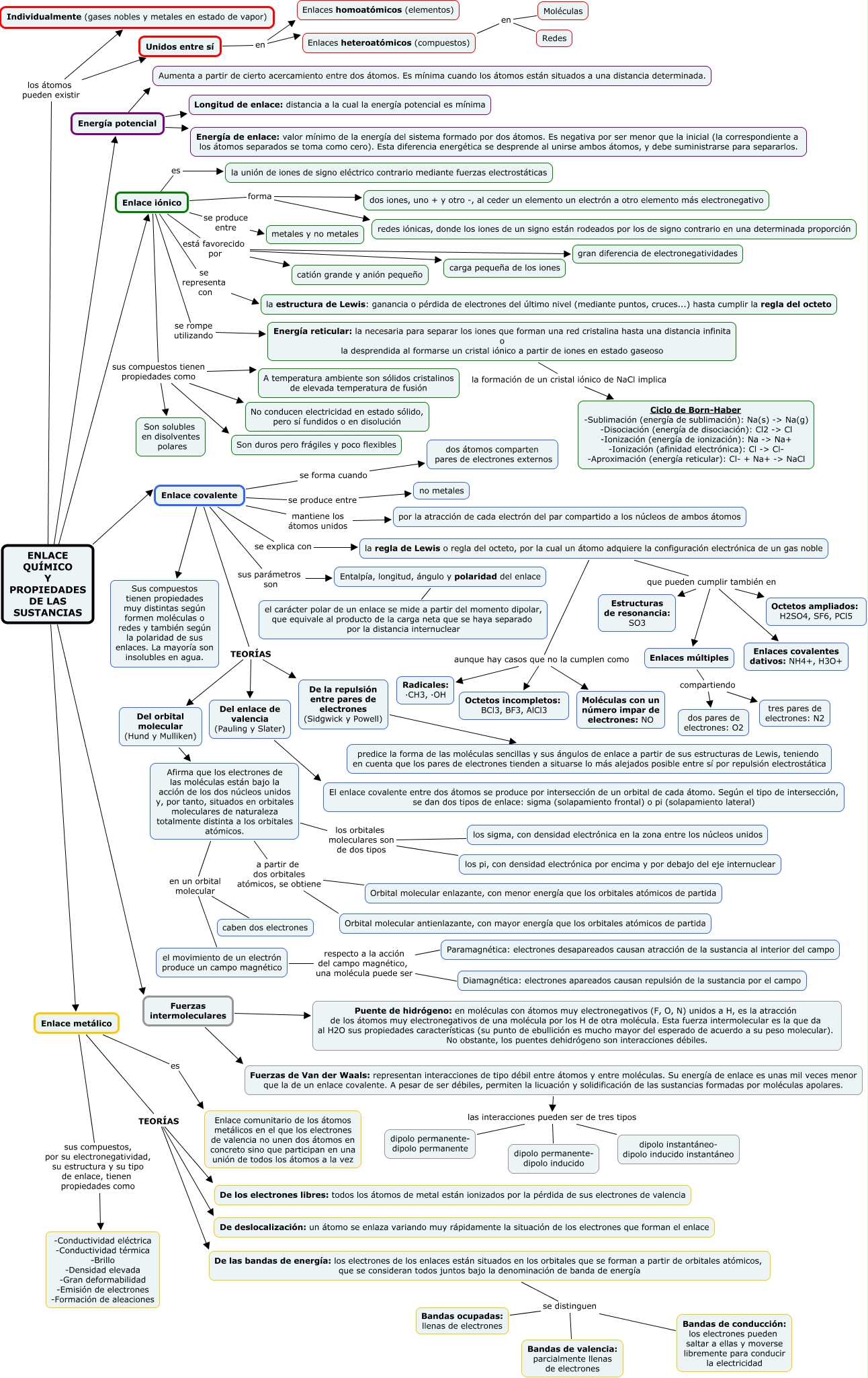 Este Cmap, tiene información relacionada con: Enlace químico y propiedades de las sustancias. Marta Albiol, ENLACE QUÍMICO Y PROPIEDADES DE LAS SUSTANCIAS los átomos pueden existir Unidos entre sí, la regla de Lewis o regla del octeto, por la cual un átomo adquiere la configuración electrónica de un gas noble que pueden cumplir también en Octetos ampliados: H2SO4, SF6, PCl5, Enlace metálico TEORÍAS De las bandas de energía: los electrones de los enlaces están situados en los orbitales que se forman a partir de orbitales atómicos, que se consideran todos juntos bajo la denominación de banda de energía, Afirma que los electrones de las moléculas están bajo la acción de los dos núcleos unidos y, por tanto, situados en orbitales moleculares de naturaleza totalmente distinta a los orbitales atómicos. a partir de dos orbitales atómicos, se obtiene Orbital molecular enlazante, con menor energía que los orbitales atómicos de partida, la regla de Lewis o regla del octeto, por la cual un átomo adquiere la configuración electrónica de un gas noble aunque hay casos que no la cumplen como Moléculas con un número impar de electrones: NO, Enlace covalente mantiene los átomos unidos por la atracción de cada electrón del par compartido a los núcleos de ambos átomos, Unidos entre sí en Enlaces heteroatómicos (compuestos), Fuerzas intermoleculares Puente de hidrógeno: en moléculas con átomos muy electronegativos (F, O, N) unidos a H, es la atracción de los átomos muy electronegativos de una molécula por los H de otra molécula. Esta fuerza intermolecular es la que da al H2O sus propiedades características (su punto de ebullición es mucho mayor del esperado de acuerdo a su peso molecular). No obstante, los puentes dehidrógeno son interacciones débiles., Enlace iónico sus compuestos tienen propiedades como A temperatura ambiente son sólidos cristalinos de elevada temperatura de fusión, De las bandas de energía: los electrones de los enlaces están situados en los orbitales que se forman a partir de orbitales atómicos, que se consideran todos juntos bajo la denominación de banda de energía se distinguen Bandas de valencia: parcialmente llenas de electrones, Enlace iónico se rompe utilizando Energía reticular: la necesaria para separar los iones que forman una red cristalina hasta una distancia infinita o la desprendida al formarse un cristal iónico a partir de iones en estado gaseoso, De la repulsión entre pares de electrones (Sidgwick y Powell) predice la forma de las moléculas sencillas y sus ángulos de enlace a partir de sus estructuras de Lewis, teniendo en cuenta que los pares de electrones tienden a situarse lo más alejados posible entre sí por repulsión electrostática, Enlace iónico es la unión de iones de signo eléctrico contrario mediante fuerzas electrostáticas, Enlace covalente se explica con la regla de Lewis o regla del octeto, por la cual un átomo adquiere la configuración electrónica de un gas noble, Enlace iónico sus compuestos tienen propiedades como Son solubles en disolventes polares, Enlace iónico se representa con la estructura de Lewis: ganancia o pérdida de electrones del último nivel (mediante puntos, cruces...) hasta cumplir la regla del octeto, Enlace iónico está favorecido por carga pequeña de los iones, Del enlace de valencia (Pauling y Slater) El enlace covalente entre dos átomos se produce por intersección de un orbital de cada átomo. Según el tipo de intersección, se dan dos tipos de enlace: sigma (solapamiento frontal) o pi (solapamiento lateral), Enlace metálico TEORÍAS De deslocalización: un átomo se enlaza variando muy rápidamente la situación de los electrones que forman el enlace, Enlace covalente TEORÍAS De la repulsión entre pares de electrones (Sidgwick y Powell)