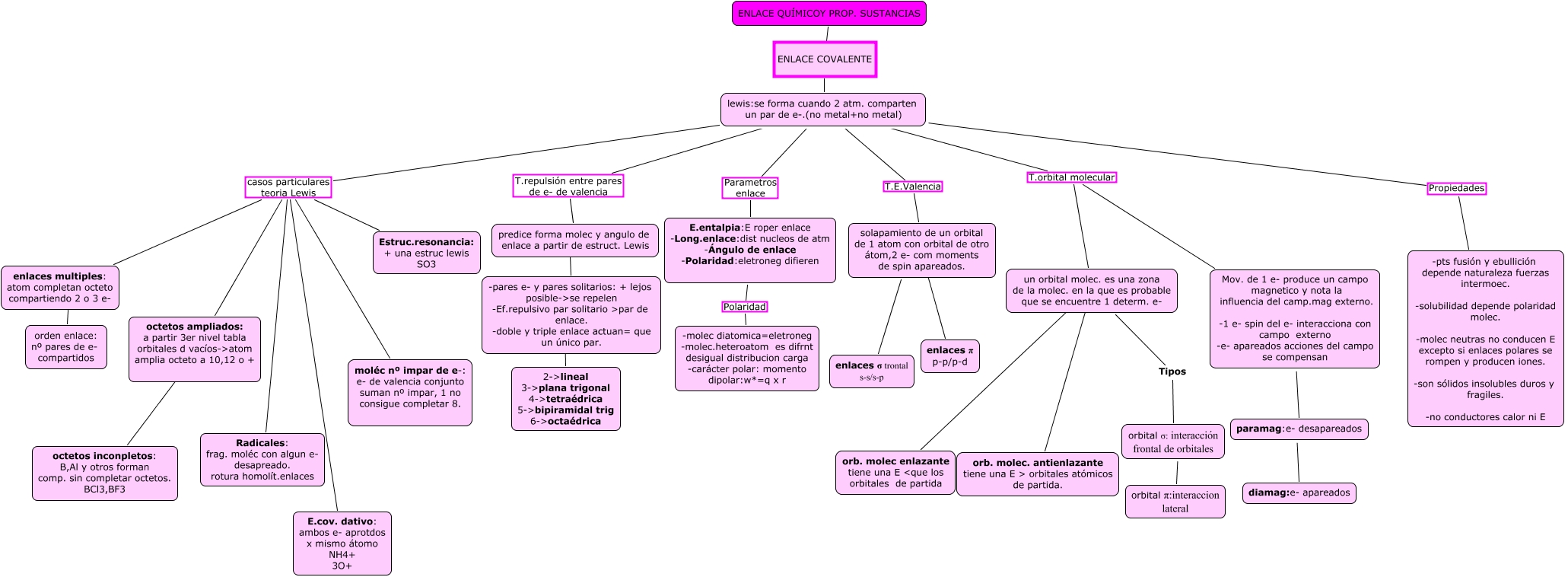Este Cmap, tiene información relacionada con: enlace quimico y propiedades de las sustancias elena 2, E.entalpia:E roper enlace -Long.enlace:dist nucleos de atm -Ángulo de enlace -Polaridad:eletroneg difieren Polaridad -molec diatomica=eletroneg -molec.heteroatom es difrnt desigual distribucion carga -carácter polar: momento dipolar:w*=q x r, paramag:e- desapareados ???? diamag:e- apareados, lewis:se forma cuando 2 atm. comparten un par de e-.(no metal+no metal) Propiedades -pts fusión y ebullición depende naturaleza fuerzas intermoec. -solubilidad depende polaridad molec. -molec neutras no conducen E excepto si enlaces polares se rompen y producen iones. -son sólidos insolubles duros y fragiles. -no conductores calor ni E, lewis:se forma cuando 2 atm. comparten un par de e-.(no metal+no metal) T.E.Valencia solapamiento de un orbital de 1 atom con orbital de otro átom,2 e- com moments de spin apareados., lewis:se forma cuando 2 atm. comparten un par de e-.(no metal+no metal) T.orbital molecular Mov. de 1 e- produce un campo magnetico y nota la influencia del camp.mag externo. -1 e- spin del e- interacciona con campo externo -e- apareados acciones del campo se compensan, lewis:se forma cuando 2 atm. comparten un par de e-.(no metal+no metal) casos particulares teoria Lewis octetos ampliados: a partir 3er nivel tabla orbitales d vacíos->atom amplia octeto a 10,12 o +, octetos ampliados: a partir 3er nivel tabla orbitales d vacíos->atom amplia octeto a 10,12 o + ???? octetos inconpletos: B,Al y otros forman comp. sin completar octetos. BCl3,BF3, un orbital molec. es una zona de la molec. en la que es probable que se encuentre 1 determ. e- Tipos orbital σ: interacción frontal de orbitales, Mov. de 1 e- produce un campo magnetico y nota la influencia del camp.mag externo. -1 e- spin del e- interacciona con campo externo -e- apareados acciones del campo se compensan ???? paramag:e- desapareados, predice forma molec y angulo de enlace a partir de estruct. Lewis ???? -pares e- y pares solitarios: + lejos posible->se repelen -Ef.repulsivo par solitario >par de enlace. -doble y triple enlace actuan= que un único par., un orbital molec. es una zona de la molec. en la que es probable que se encuentre 1 determ. e- ???? orb. molec. antienlazante tiene una E > orbitales atómicos de partida., lewis:se forma cuando 2 atm. comparten un par de e-.(no metal+no metal) T.orbital molecular un orbital molec. es una zona de la molec. en la que es probable que se encuentre 1 determ. e-, solapamiento de un orbital de 1 atom con orbital de otro átom,2 e- com moments de spin apareados. ???? enlaces σ trontal s-s/s-p, lewis:se forma cuando 2 atm. comparten un par de e-.(no metal+no metal) casos particulares teoria Lewis moléc nº impar de e-: e- de valencia conjunto suman nº impar, 1 no consigue completar 8., lewis:se forma cuando 2 atm. comparten un par de e-.(no metal+no metal) T.repulsión entre pares de e- de valencia predice forma molec y angulo de enlace a partir de estruct. Lewis, un orbital molec. es una zona de la molec. en la que es probable que se encuentre 1 determ. e- ???? orb. molec enlazante tiene una E <que los orbitales de partida, -pares e- y pares solitarios: + lejos posible->se repelen -Ef.repulsivo par solitario >par de enlace. -doble y triple enlace actuan= que un único par. ???? 2->lineal 3->plana trigonal 4->tetraédrica 5->bipiramidal trig 6->octaédrica, lewis:se forma cuando 2 atm. comparten un par de e-.(no metal+no metal) casos particulares teoria Lewis Radicales: frag. moléc con algun e- desapreado. rotura homolít.enlaces, solapamiento de un orbital de 1 atom con orbital de otro átom,2 e- com moments de spin apareados. ???? enlaces π p-p/p-d, lewis:se forma cuando 2 atm. comparten un par de e-.(no metal+no metal) casos particulares teoria Lewis enlaces multiples: atom completan octeto compartiendo 2 o 3 e-
