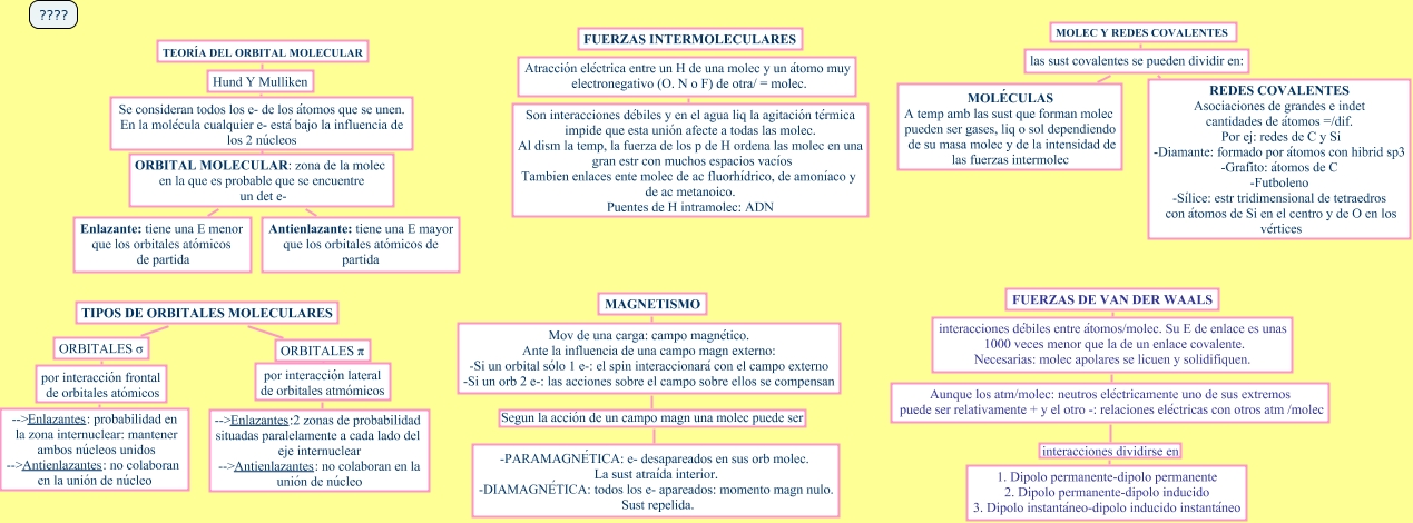 Este Cmap, tiene información relacionada con: CLAUDIA 4, por interacción lateral de orbitales atmómicos -->Enlazantes:2 zonas de probabilidad situadas paralelamente a cada lado del eje internuclear -->Antienlazantes: no colaboran en la unión de núcleo, las sust covalentes se pueden dividir en: MOLÉCULAS A temp amb las sust que forman molec pueden ser gases, liq o sol dependiendo de su masa molec y de la intensidad de las fuerzas intermolec, Aunque los atm/molec: neutros eléctricamente uno de sus extremos puede ser relativamente + y el otro -: relaciones eléctricas con otros atm /molec interacciones dividirse en 1. Dipolo permanente-dipolo permanente 2. Dipolo permanente-dipolo inducido 3. Dipolo instantáneo-dipolo inducido instantáneo, TEORÍA DEL ORBITAL MOLECULAR Hund Y Mulliken, ORBITALES σ por interacción frontal de orbitales atómicos, las sust covalentes se pueden dividir en: REDES COVALENTES Asociaciones de grandes e indet cantidades de átomos =/dif. Por ej: redes de C y Si -Diamante: formado por átomos con hibrid sp3 -Grafito: átomos de C -Futboleno -Sílice: estr tridimensional de tetraedros con átomos de Si en el centro y de O en los vértices, TIPOS DE ORBITALES MOLECULARES ORBITALES σ, por interacción frontal de orbitales atómicos -->Enlazantes: probabilidad en la zona internuclear: mantener ambos núcleos unidos -->Antienlazantes: no colaboran en la unión de núcleo, Hund Y Mulliken Se consideran todos los e- de los átomos que se unen. En la molécula cualquier e- está bajo la influencia de los 2 núcleos, TIPOS DE ORBITALES MOLECULARES ORBITALES π, Mov de una carga: campo magnético. Ante la influencia de una campo magn externo: -Si un orbital sólo 1 e-: el spin interaccionará con el campo externo -Si un orb 2 e-: las acciones sobre el campo sobre ellos se compensan Segun la acción de un campo magn una molec puede ser -PARAMAGNÉTICA: e- desapareados en sus orb molec. La sust atraída interior. -DIAMAGNÉTICA: todos los e- apareados: momento magn nulo. Sust repelida., MOLEC Y REDES COVALENTES las sust covalentes se pueden dividir en:, MAGNETISMO Mov de una carga: campo magnético. Ante la influencia de una campo magn externo: -Si un orbital sólo 1 e-: el spin interaccionará con el campo externo -Si un orb 2 e-: las acciones sobre el campo sobre ellos se compensan, interacciones débiles entre átomos/molec. Su E de enlace es unas 1000 veces menor que la de un enlace covalente. Necesarias: molec apolares se licuen y solidifiquen. Aunque los atm/molec: neutros eléctricamente uno de sus extremos puede ser relativamente + y el otro -: relaciones eléctricas con otros atm /molec, ORBITAL MOLECULAR: zona de la molec en la que es probable que se encuentre un det e- Enlazante: tiene una E menor que los orbitales atómicos de partida, ORBITALES π por interacción lateral de orbitales atmómicos, Atracción eléctrica entre un H de una molec y un átomo muy electronegativo (O. N o F) de otra/ = molec. Son interacciones débiles y en el agua liq la agitación térmica impide que esta unión afecte a todas las molec. Al dism la temp, la fuerza de los p de H ordena las molec en una gran estr con muchos espacios vacíos Tambien enlaces ente molec de ac fluorhídrico, de amoníaco y de ac metanoico. Puentes de H intramolec: ADN, ORBITAL MOLECULAR: zona de la molec en la que es probable que se encuentre un det e- Antienlazante: tiene una E mayor que los orbitales atómicos de partida, Se consideran todos los e- de los átomos que se unen. En la molécula cualquier e- está bajo la influencia de los 2 núcleos ORBITAL MOLECULAR: zona de la molec en la que es probable que se encuentre un det e-, FUERZAS DE VAN DER WAALS interacciones débiles entre átomos/molec. Su E de enlace es unas 1000 veces menor que la de un enlace covalente. Necesarias: molec apolares se licuen y solidifiquen.