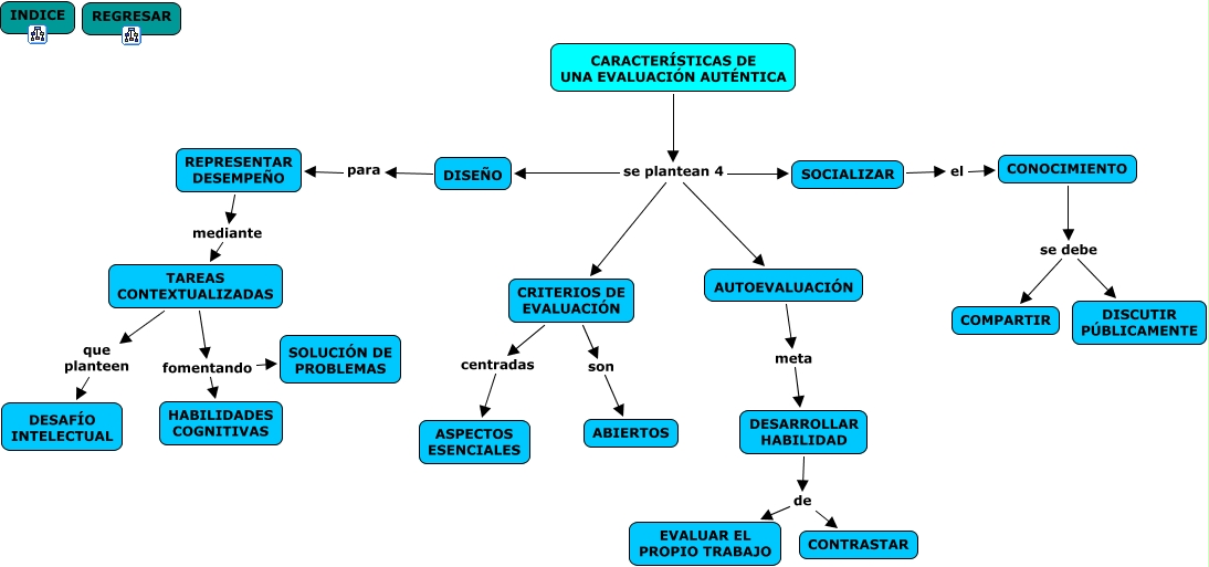 Este Cmap, tiene información relacionada con: CARACTERÍSTICAS DE UNA EVALUACIÓN AUTÉNTICA, DESARROLLAR HABILIDAD de CONTRASTAR, DESARROLLAR HABILIDAD de EVALUAR EL PROPIO TRABAJO, CARACTERÍSTICAS DE UNA EVALUACIÓN AUTÉNTICA se plantean 4 SOCIALIZAR, DISEÑO para REPRESENTAR DESEMPEÑO, TAREAS CONTEXTUALIZADAS fomentando HABILIDADES COGNITIVAS, CONOCIMIENTO se debe COMPARTIR, CRITERIOS DE EVALUACIÓN centradas ASPECTOS ESENCIALES, AUTOEVALUACIÓN meta DESARROLLAR HABILIDAD, CONOCIMIENTO se debe DISCUTIR PÚBLICAMENTE, CARACTERÍSTICAS DE UNA EVALUACIÓN AUTÉNTICA se plantean 4 CRITERIOS DE EVALUACIÓN, SOCIALIZAR el CONOCIMIENTO, CRITERIOS DE EVALUACIÓN son ABIERTOS, REPRESENTAR DESEMPEÑO mediante TAREAS CONTEXTUALIZADAS, TAREAS CONTEXTUALIZADAS fomentando SOLUCIÓN DE PROBLEMAS, CARACTERÍSTICAS DE UNA EVALUACIÓN AUTÉNTICA se plantean 4 DISEÑO, CARACTERÍSTICAS DE UNA EVALUACIÓN AUTÉNTICA se plantean 4 AUTOEVALUACIÓN, TAREAS CONTEXTUALIZADAS que planteen DESAFÍO INTELECTUAL