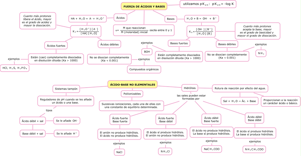 en disolución diluida (Ka ≻ 1000) </mtext> </mrow> </math>, <math xmlns="http://www.w3.org/1998/Math/MathML"> <mrow> <mtext> HA + </mtext> <mmultiscripts> <mtext> H </mtext> <mtext> 2 </mtext> <none/> </mmultiscripts> <mtext> O = </mtext> <mmultiscripts> <mtext> A </mtext> <none/> <mtext> - </mtext> </mmultiscripts> <mtext> + </mtext> <mmultiscripts> <mtext> H </mtext> <mtext> 3 </mtext> <none/> </mmultiscripts> <mmultiscripts> <mtext> O </mtext> <none/> <mtext> + </mtext> </mmultiscripts> </mrow> </math> <math xmlns="http://www.w3.org/1998/Math/MathML"> <mrow> <mmultiscripts> <mtext> K </mtext> <mtext> a </mtext> <none/> </mmultiscripts> <mtext> = </mtext> <mfrac> <mrow> <mtext> [ </mtext> <mrow> <mmultiscripts> <mtext> H </mtext> <mtext> 3 </mtext> <none/> </mmultiscripts> <mmultiscripts> <mtext> O </mtext> <none/> <mtext> + </mtext> </mmultiscripts> </mrow> <mrow> <mtext> ] [ </mtext> <mmultiscripts> <mtext> A </mtext> <none/> <mtext> - </mtext> </mmultiscripts> <mtext> ] </mtext> </mrow> </mrow> <mrow> <mtext> [ </mtext> <mtext> HA] [ </mtext> <mrow> <mmultiscripts> <mtext> H </mtext> <mtext> 2 </mtext> <none/> </mmultiscripts> <mtext> O] </mtext> </mrow> </mrow> </mfrac> </mrow> </math>, <math xmlns="http://www.w3.org/1998/Math/MathML"> <mrow> <mmultiscripts> <mtext> K </mtext> <mtext> a </mtext> <none/> </mmultiscripts> <mtext> = </mtext> <mfrac> <mrow> <mtext> [ </mtext> <mrow> <mmultiscripts> <mtext> H </mtext> <mtext> 3 </mtext> <none/> </mmultiscripts> <mmultiscripts> <mtext> O </mtext> <none/> <mtext> + </mtext> </mmultiscripts> </mrow> <mrow> <mtext> ] [ </mtext> <mmultiscripts> <mtext> A </mtext> <none/> <mtext> - </mtext> </mmultiscripts> <mtext> ] </mtext> </mrow> </mrow> <mrow> <mtext> [ </mtext> <mtext> HA] [ </mtext> <mrow> <mmultiscripts> <mtext> H </mtext> <mtext> 2 </mtext> <none/> </mmultiscripts> <mtext> O] </mtext> </mrow> </mrow> </mfrac> </mrow> </math> Cuanto más protones libera el ácido, mayor es el grado de acidez y mayor la disociación., Hidrólisis las sales pueden estar formadas por Ácido fuerte Base fuerte, <math xmlns="http://www.w3.org/1998/Math/MathML"> <mrow> <mmultiscripts> <mtext> K </mtext> <mtext> b </mtext> <none/> </mmultiscripts> <mtext> = </mtext> <mfrac> <mrow> <mtext> [ </mtext> <mrow> <mmultiscripts> <mtext> OH </mtext> <none/> <mtext> - </mtext> </mmultiscripts> <mtext> ] [ </mtext> <mmultiscripts> <mtext> B </mtext> <none/> <mtext> + </mtext> </mmultiscripts> <mtext> ] </mtext> </mrow> </mrow> <mrow> <mtext> [ </mtext> <mrow> <mmultiscripts> <mtext> H </mtext> <mtext> 2 </mtext> <none/> </mmultiscripts> <mtext> O </mtext> </mrow> <mtext> ] [B </mtext> <mrow> <mtext> ] </mtext> </mrow> </mrow> </mfrac> </mrow> </math> Bases fuertes, Ácido débil + sal Base débil + sal, FUERZA DE ÁCIDOS Y BASES <math xmlns="http://www.w3.org/1998/Math/MathML"> <mrow> <mtext> α= </mtext> <mfrac> <mtext> M que reaccionan </mtext> <mtext> M (molaridad) inicial </mtext> </mfrac> <mtext> oscila entre 0 y 1 </mtext> </mrow> </math>, Hidrólisis Rotura de reacción por efecto del agua., Ácido débil + sal <math xmlns="http://www.w3.org/1998/Math/MathML"> <mrow> <mtext> Se le añade </mtext> <mmultiscripts> <mtext> OH </mtext> <none/> <mtext> - </mtext> </mmultiscripts> </mrow> </math>, El ácido no produce hidrólisis. La base sí produce hidrólisis. ejemplos <math xmlns="http://www.w3.org/1998/Math/MathML"> <mrow> <mtext> NaC </mtext> <mmultiscripts> <mtext> H </mtext> <mtext> 3 </mtext> <none/> </mmultiscripts> <mtext> COO </mtext> </mrow> </math>, Ácido débil Base fuerte El ácido no produce hidrólisis. La base sí produce hidrólisis.