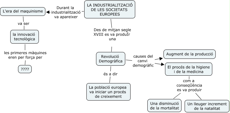 Aquest mapa conceptual conté informació relacionada amb: Maapa socials tema 3, la innovació tecnològica les primeres màquines eren per força per ????, LA INDUSTRIALITZACIÓ DE LES SOCIETATS EUROPEES Durant la industrialització va apareixer L'era del maquinisme, Revolució Demogràfica causes del canvi demogràfic El procés de la higiene i de la medicina, El procés de la higiene i de la medicina com a conseqÜència es va produir Un lleuger increment de la natalitat, L'era del maquinisme va ser la innovació tecnològica, LA INDUSTRIALITZACIÓ DE LES SOCIETATS EUROPEES Des de mitjan segle XVIII es va produÏr una Revolució Demogràfica, Revolució Demogràfica és a dir La població europea va iniciar un procés de creixement, Revolució Demogràfica causes del canvi demogràfic Augment de la producció, El procés de la higiene i de la medicina com a conseqÜència es va produir Una disminució de la mortalitat