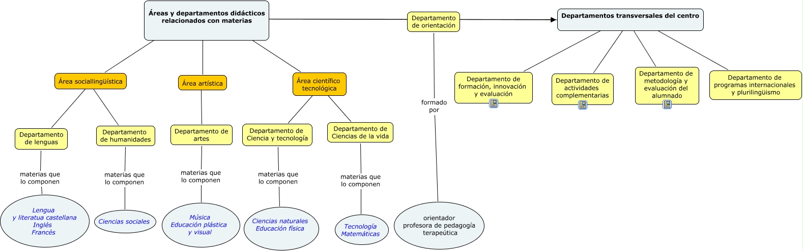 Este Cmap, tiene información relacionada con: organigrma áreas y departamentos, Departamentos transversales del centro ???? Departamento de metodología y evaluación del alumnado, Departamento de Ciencias de la vida materias que lo componen Tecnología Matemáticas, Áreas y departamentos didácticos relacionados con materias ???? Departamentos transversales del centro, Departamento de orientación formado por orientador profesora de pedagogía terapeútica, Área sociallingüística ???? Departamento de lenguas, Departamentos transversales del centro ???? Áreas y departamentos específicos asociados a materias, Área científico tecnológica ???? Departamento de Ciencia y tecnología, Departamentos transversales del centro ???? Departamento de formación, innovación y evaluación, Áreas y departamentos específicos asociados a materias ???? Área sociallingüística, Departamento de humanidades materias que lo componen Ciencias sociales, Áreas y departamentos específicos asociados a materias ???? Área artística, Departamentos transversales del centro ???? Departamento de programas internacionales y plurilingüismo, Áreas y departamentos específicos asociados a materias ???? Área científico tecnológica, Departamento de artes materias que lo componen Música Educación plástica y visual, Departamento de lenguas materias que lo componen Lengua y literatua castellana Inglés Francés, Área sociallingüística ???? Departamento de humanidades, Departamentos transversales del centro ???? Departamento de actividades complementarias, Departamento de Ciencia y tecnología materias que lo componen Ciencias naturales Educación física, Área artística ???? Departamento de artes, Área científico tecnológica ???? Departamento de Ciencias de la vida