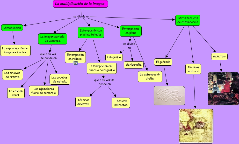 tema de plástica, La multiplicación de la imagen se divide en Otras técnicas de estampación, La multiplicación de la imagen se divide en Introducción, La multiplicación de la imagen se divide en Estampación en plano, La imagen seriada: La estampa. que a su vez se divide en Las pruebas de estado., Estampación en hueco o calcografía que a su vez se divide en Técnicas directas., Estampación con plachas talladas Estampación en relieve., Estampación en plano se divide en Litografía, Estampación en hueco o calcografía que a su vez se divide en Técnicas indirectas., El gofrado , La imagen seriada: La estampa. que a su vez se divide en Los ejemplares fuera de comercio.