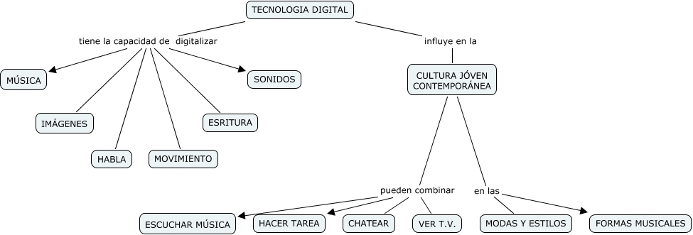 Este Cmap, tiene información relacionada con: TECNOLOGIA1, CULTURA JÓVEN CONTEMPORÁNEA pueden combinar CHATEAR, CULTURA JÓVEN CONTEMPORÁNEA pueden combinar ESCUCHAR MÚSICA, TECNOLOGIA DIGITAL tiene la capacidad de digitalizar SONIDOS, TECNOLOGIA DIGITAL tiene la capacidad de digitalizar MOVIMIENTO, CULTURA JÓVEN CONTEMPORÁNEA en las MODAS Y ESTILOS, CULTURA JÓVEN CONTEMPORÁNEA en las FORMAS MUSICALES, TECNOLOGIA DIGITAL tiene la capacidad de digitalizar IMÁGENES, TECNOLOGIA DIGITAL tiene la capacidad de digitalizar HABLA, TECNOLOGIA DIGITAL influye en la CULTURA JÓVEN CONTEMPORÁNEA, TECNOLOGIA DIGITAL tiene la capacidad de digitalizar MÚSICA, TECNOLOGIA DIGITAL tiene la capacidad de digitalizar ESRITURA, CULTURA JÓVEN CONTEMPORÁNEA pueden combinar VER T.V., CULTURA JÓVEN CONTEMPORÁNEA pueden combinar HACER TAREA