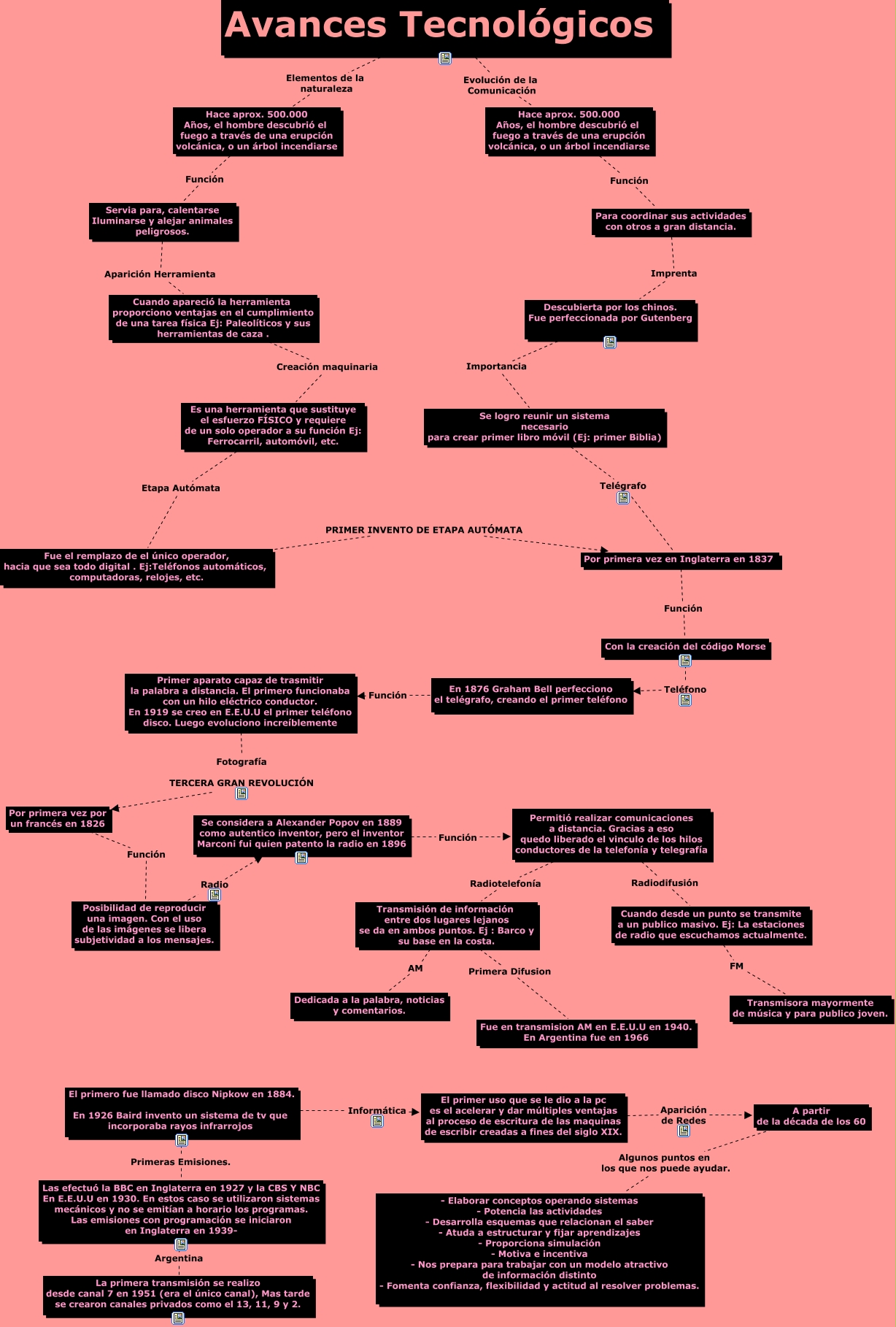 Evolucion tecnologia 4, Hace aprox. 500.000 Años, el hombre descubrió el fuego a través de una erupción volcánica, o un árbol incendiarse Función Para coordinar sus actividades con otros a gran distancia., El primero fue llamado disco Nipkow en 1884. En 1926 Baird invento un sistema de tv que incorporaba rayos infrarrojos Informática El primer uso que se le dio a la pc es el acelerar y dar múltiples ventajas al proceso de escritura de las maquinas de escribir creadas a fines del siglo XIX., Transmisión de información entre dos lugares lejanos se da en ambos puntos. Ej : Barco y su base en la costa. Primera Difusion Fue en transmision AM en E.E.U.U en 1940. En Argentina fue en 1966, Primer aparato capaz de trasmitir la palabra a distancia. El primero funcionaba con un hilo eléctrico conductor. En 1919 se creo en E.E.U.U el primer teléfono disco. Luego evoluciono increíblemente Fotografía TERCERA GRAN REVOLUCIÓN Por primera vez por un francés en 1826, Por primera vez en Inglaterra en 1837 Función Con la creación del código Morse, Servia para, calentarse Iluminarse y alejar animales peligrosos. Aparición Herramienta Cuando apareció la herramienta proporciono ventajas en el cumplimiento de una tarea física Ej: Paleolíticos y sus herramientas de caza ., Hace aprox. 500.000 Años, el hombre descubrió el fuego a través de una erupción volcánica, o un árbol incendiarse Función Servia para, calentarse Iluminarse y alejar animales peligrosos., Por primera vez por un francés en 1826 Función Posibilidad de reproducir una imagen. Con el uso de las imágenes se libera subjetividad a los mensajes., Se considera a Alexander Popov en 1889 como autentico inventor, pero el inventor Marconi fui quien patento la radio en 1896 Función Permitió realizar comunicaciones a distancia. Gracias a eso quedo liberado el vinculo de los hilos conductores de la telefonía y telegrafía, Fue el remplazo de el único operador, hacia que sea todo digital . Ej:Teléfonos automáticos, computadoras, relojes, etc. PRIMER INVENTO DE ETAPA AUTÓMATA Por primera vez en Inglaterra en 1837