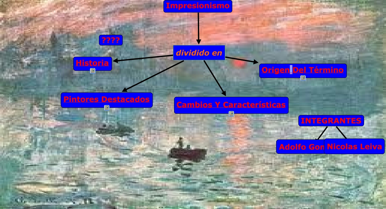 Este Cmap, tiene información relacionada con: Impresionismo xD, Impresionismo dividido en Pintores Destacados, Impresionismo dividido en Origen Del Término, Impresionismo dividido en Historia, INTEGRANTES ???? Nicolas Leiva, Impresionismo dividido en Cambios Y Características, INTEGRANTES ???? Adolfo Gomez