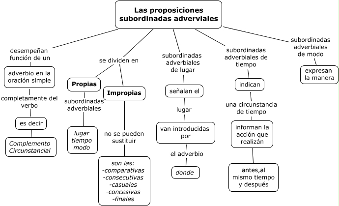 Este Cmap, tiene información relacionada con: Sin Título 3, van introducidas por el adverbio donde, Las proposiciones subordinadas adverviales se dividen en Impropias, Las proposiciones subordinadas adverviales subordinadas adverbiales de tiempo indican, Impropias no se pueden sustituir son las: -comparativas -consecutivas -casuales -concesivas -finales, adverbio en la oración simple completamente del verbo es decir, Propias subordinadas adverbiales lugar tiempo modo, es decir ???? Complemento Circunstancial, Las proposiciones subordinadas adverviales subordinadas adverbiales de lugar señalan el, indican una circunstancia de tiempo informan la acción que realizán, señalan el lugar van introducidas por, Las proposiciones subordinadas adverviales se dividen en Propias, informan la acción que realizán ???? antes,al mismo tiempo y después, Las proposiciones subordinadas adverviales subordinadas adverbiales de modo expresan la manera, Las proposiciones subordinadas adverviales desempeñan función de un adverbio en la oración simple