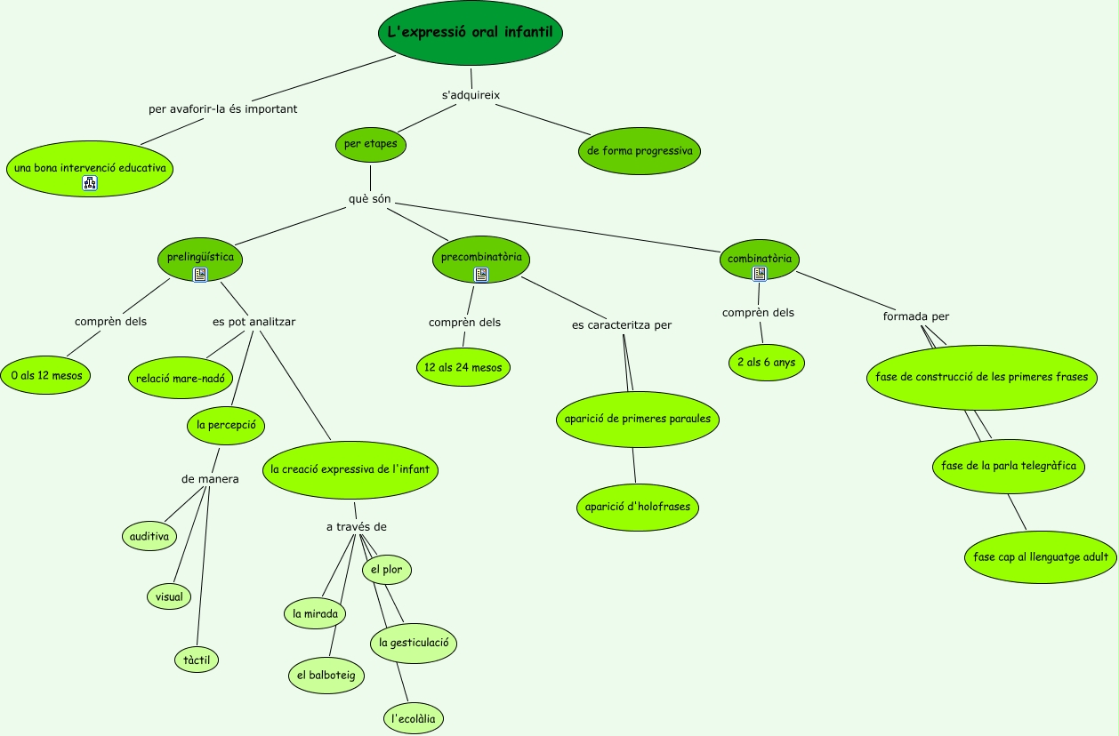 Este Cmap, tiene información relacionada con: Activitat 4, per etapes què són combinatòria, combinatòria formada per fase de construcció de les primeres frases, per etapes què són precombinatòria, prelingüística es pot analitzar la percepció, la percepció de manera visual, L'expressió oral infantil s'adquireix per etapes, prelingüística es pot analitzar la creació expressiva de l'infant, prelingüística es pot analitzar relació mare-nadó, la creació expressiva de l'infant a través de el balboteig, precombinatòria es caracteritza per aparició d'holofrases, combinatòria comprèn dels 2 als 6 anys, combinatòria formada per fase cap al llenguatge adult, precombinatòria comprèn dels 12 als 24 mesos, la percepció de manera auditiva, la creació expressiva de l'infant a través de el plor, per etapes què són prelingüística, la creació expressiva de l'infant a través de la gesticulació, L'expressió oral infantil per avaforir-la és important una bona intervenció educativa, prelingüística comprèn dels 0 als 12 mesos, la creació expressiva de l'infant a través de l'ecolàlia