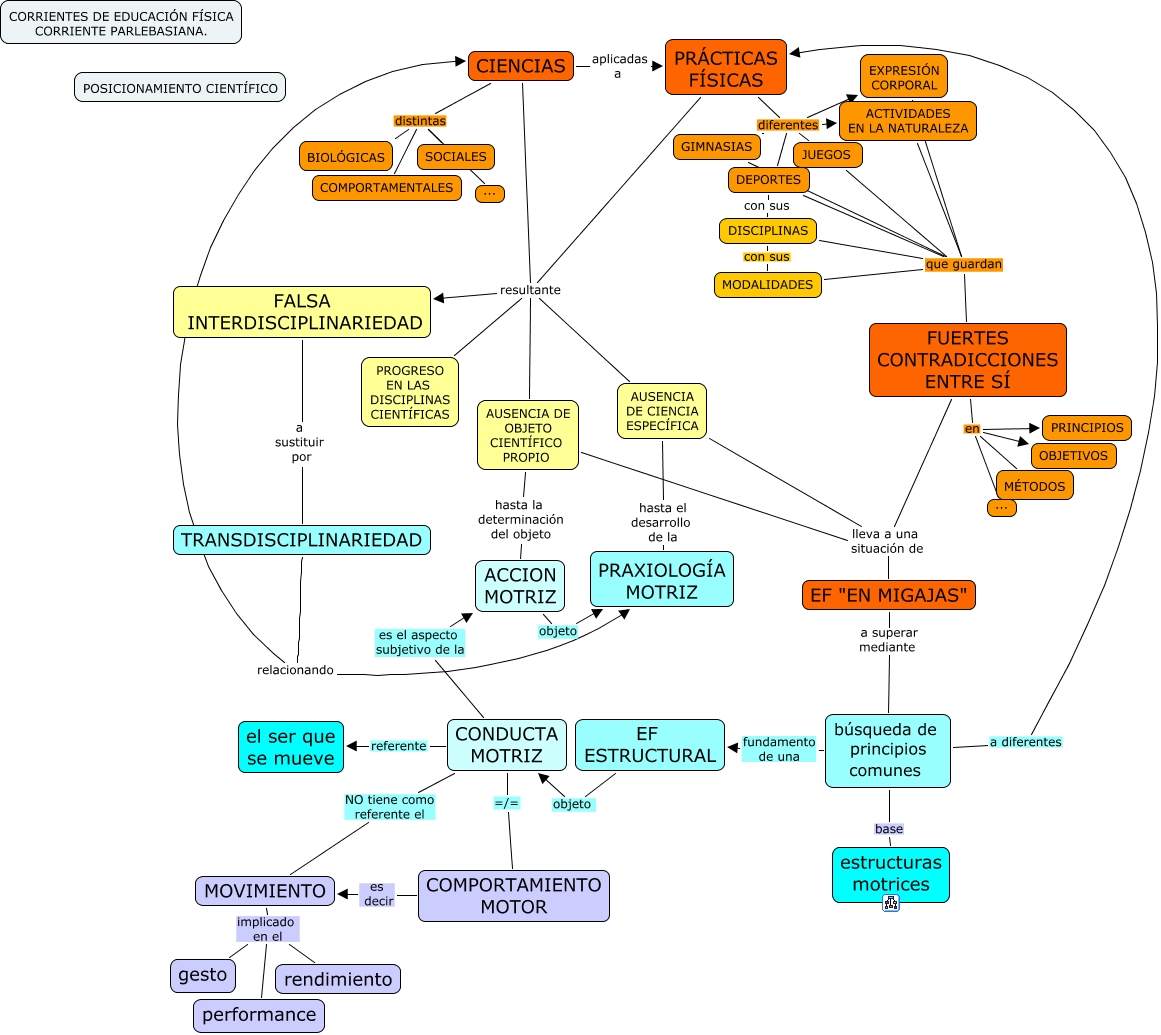 Este Cmap, tiene información relacionada con: prax_falsa interdisiplinariedad, CIENCIAS resultante FALSA INTERDISCIPLINARIEDAD, AUSENCIA DE CIENCIA ESPECÍFICA lleva a una situación de EF "EN MIGAJAS", EXPRESIÓN CORPORAL que guardan FUERTES CONTRADICCIONES ENTRE SÍ, CONDUCTA MOTRIZ referente el ser que se mueve, AUSENCIA DE OBJETO CIENTÍFICO PROPIO lleva a una situación de EF "EN MIGAJAS", PRÁCTICAS FÍSICAS diferentes EXPRESIÓN CORPORAL, PRÁCTICAS FÍSICAS resultante AUSENCIA DE OBJETO CIENTÍFICO PROPIO, CIENCIAS aplicadas a PRÁCTICAS FÍSICAS, PRÁCTICAS FÍSICAS resultante AUSENCIA DE CIENCIA ESPECÍFICA, CIENCIAS resultante AUSENCIA DE CIENCIA ESPECÍFICA, MOVIMIENTO implicado en el performance, búsqueda de principios comunes fundamento de una EF ESTRUCTURAL, EF "EN MIGAJAS" a superar mediante búsqueda de principios comunes, TRANSDISCIPLINARIEDAD relacionando PRAXIOLOGÍA MOTRIZ, CIENCIAS distintas ..., CIENCIAS distintas COMPORTAMENTALES, PRÁCTICAS FÍSICAS diferentes JUEGOS, PRÁCTICAS FÍSICAS diferentes DEPORTES, TRANSDISCIPLINARIEDAD relacionando CIENCIAS, MOVIMIENTO implicado en el gesto