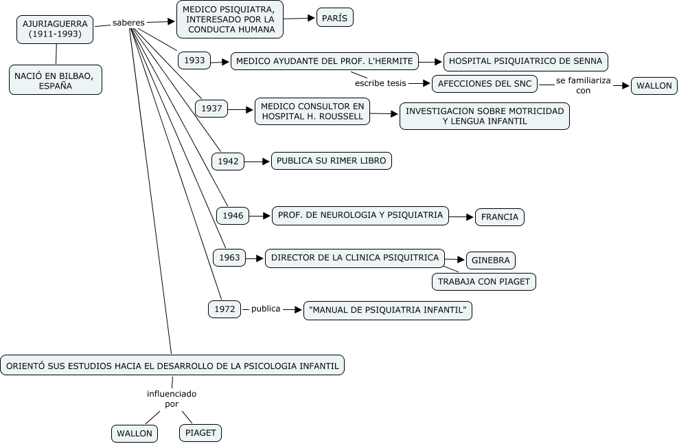 Este Cmap, tiene información relacionada con: BIOGRAFIA AJURIAGUERRA.cmap, DIRECTOR DE LA CLINICA PSIQUITRICA ???? GINEBRA, ORIENTÓ SUS ESTUDIOS HACIA EL DESARROLLO DE LA PSICOLOGIA INFANTIL influenciado por WALLON, MEDICO PSIQUIATRA, INTERESADO POR LA CONDUCTA HUMANA ???? PARÍS, AJURIAGUERRA (1911-1993) saberes 1933, AJURIAGUERRA (1911-1993) saberes 1972, MEDICO AYUDANTE DEL PROF. L'HERMITE escribe tesis AFECCIONES DEL SNC, AJURIAGUERRA (1911-1993) saberes ORIENTÓ SUS ESTUDIOS HACIA EL DESARROLLO DE LA PSICOLOGIA INFANTIL, AFECCIONES DEL SNC se familiariza con WALLON, 1946 ???? PROF. DE NEUROLOGIA Y PSIQUIATRIA, AJURIAGUERRA (1911-1993) saberes 1963, 1933 ???? MEDICO AYUDANTE DEL PROF. L'HERMITE, AJURIAGUERRA (1911-1993) saberes MEDICO PSIQUIATRA, INTERESADO POR LA CONDUCTA HUMANA, AJURIAGUERRA (1911-1993) saberes 1942, AJURIAGUERRA (1911-1993) saberes 1946, 1963 ???? DIRECTOR DE LA CLINICA PSIQUITRICA, MEDICO AYUDANTE DEL PROF. L'HERMITE ???? HOSPITAL PSIQUIATRICO DE SENNA, MEDICO CONSULTOR EN HOSPITAL H. ROUSSELL ???? INVESTIGACION SOBRE MOTRICIDAD Y LENGUA INFANTIL, AJURIAGUERRA (1911-1993) saberes 1937, 1937 ???? MEDICO CONSULTOR EN HOSPITAL H. ROUSSELL, 1972 publica "MANUAL DE PSIQUIATRIA INFANTIL"