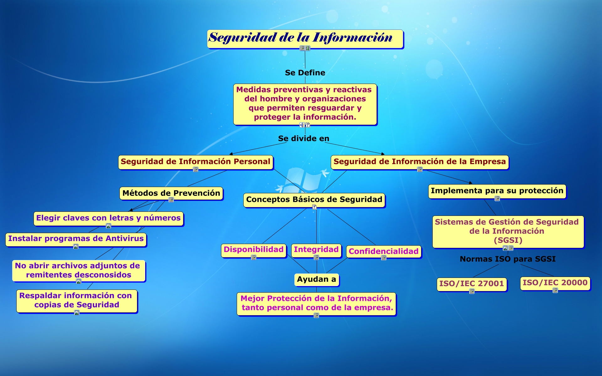 Este mapa conceptual tiene información relacionada a: Seguridad de La información, Conceptos Básicos de Seguridad ???? Integridad, Conceptos Básicos de Seguridad ???? Disponibilidad, Confidencialidad ???? Ayudan a, Sistemas de Gestión de Seguridad de la Información (SGSI) Normas ISO para SGSI ISO/IEC 27001, Integridad ???? Ayudan a, Conceptos Básicos de Seguridad ???? Confidencialidad, Seguridad de Información Personal ???? Métodos de Prevención, Métodos de Prevención ???? Elegir claves con letras y números, Métodos de Prevención ???? Respaldar información con copias de Seguridad, Seguridad de Información Personal ???? Conceptos Básicos de Seguridad, Seguridad de Información de la Empresa ???? Conceptos Básicos de Seguridad, Seguridad de Información de la Empresa ???? Implementa para su protección, Métodos de Prevención ???? Instalar programas de Antivirus, Sistemas de Gestión de Seguridad de la Información (SGSI) Normas ISO para SGSI ISO/IEC 20000, Seguridad de la Información Se Define Medidas preventivas y reactivas del hombre y organizaciones que permiten resguardar y proteger la información., Ayudan a ???? Mejor Protección de la Información, tanto personal como de la empresa., Elegir claves con letras y números ???? No abrir archivos adjuntos de remitentes desconosidos, Implementa para su protección ???? Sistemas de Gestión de Seguridad de la Información (SGSI), Disponibilidad ???? Ayudan a, Medidas preventivas y reactivas del hombre y organizaciones que permiten resguardar y proteger la información. Se divide en Seguridad de Información de la Empresa