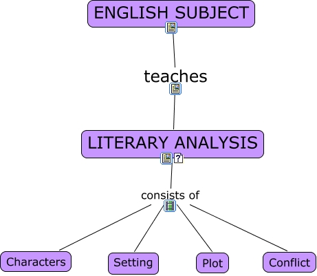 Este mapa conceptual tiene información relacionada a: english, LITERARY ANALYSIS consists of Setting, LITERARY ANALYSIS consists of Conflict, LITERARY ANALYSIS consists of Plot, ENGLISH SUBJECT teaches LITERARY ANALYSIS, LITERARY ANALYSIS consists of Characters