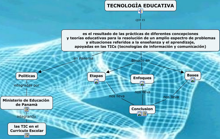 Este mapa conceptual tiene información relacionada a: TECNOLOGIA EDUCATIVA, es el resultado de las prácticas de diferentes concepciones y teorías educativas para la resolución de un amplio espectro de problemas y situaciones referidos a la enseñanza y el aprendizaje, apoyadas en las TICs (tecnologías de información y comunicación) Basado en Bases, Ministerio de Educaciòn de Panamà integrando las TIC en el Curriculo Escolar, es el resultado de las prácticas de diferentes concepciones y teorías educativas para la resolución de un amplio espectro de problemas y situaciones referidos a la enseñanza y el aprendizaje, apoyadas en las TICs (tecnologías de información y comunicación) Basado en Etapas, Etapas nos lleva Conclusion, Politicas integradas por Ministerio de Educaciòn de Panamà, es el resultado de las prácticas de diferentes concepciones y teorías educativas para la resolución de un amplio espectro de problemas y situaciones referidos a la enseñanza y el aprendizaje, apoyadas en las TICs (tecnologías de información y comunicación) Basado en Enfoques, Bases nos lleva Conclusion, TECNOLOGÌA EDUCATIVA QUE ES es el resultado de las prácticas de diferentes concepciones y teorías educativas para la resolución de un amplio espectro de problemas y situaciones referidos a la enseñanza y el aprendizaje, apoyadas en las TICs (tecnologías de información y comunicación), es el resultado de las prácticas de diferentes concepciones y teorías educativas para la resolución de un amplio espectro de problemas y situaciones referidos a la enseñanza y el aprendizaje, apoyadas en las TICs (tecnologías de información y comunicación) en Panamà Politicas, Enfoques nos lleva Conclusion
