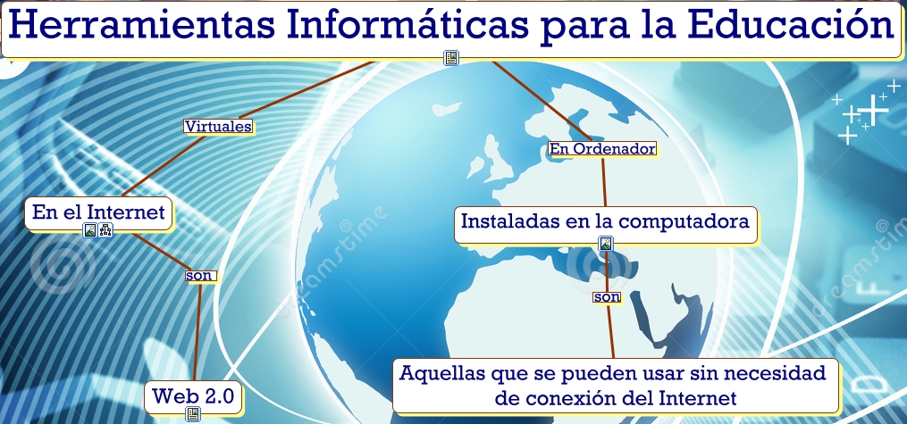 Este mapa conceptual tiene información relacionada a: grup0', Herramientas Informáticas para la Educación En Ordenador Instaladas en la computadora, Herramientas Informáticas para la Educación Virtuales En el Internet, Instaladas en la computadora son Aquellas que se pueden usar sin necesidad de conexión del Internet, En el Internet son Web 2.0