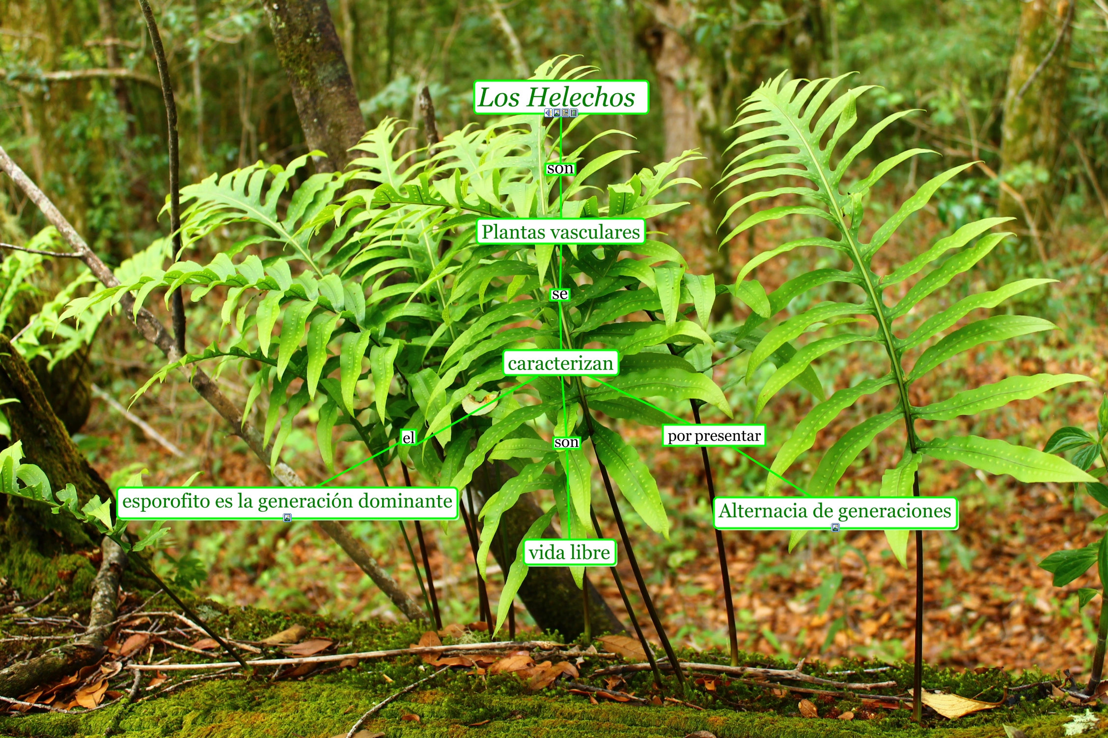 Este mapa conceptual tiene información relacionada a: Los Helechos 1, caracterizan por presentar Alternacia de generaciones, caracterizan el esporofito es la generación dominante, Los Helechos son Plantas vasculares, caracterizan son vida libre, Plantas vasculares se caracterizan