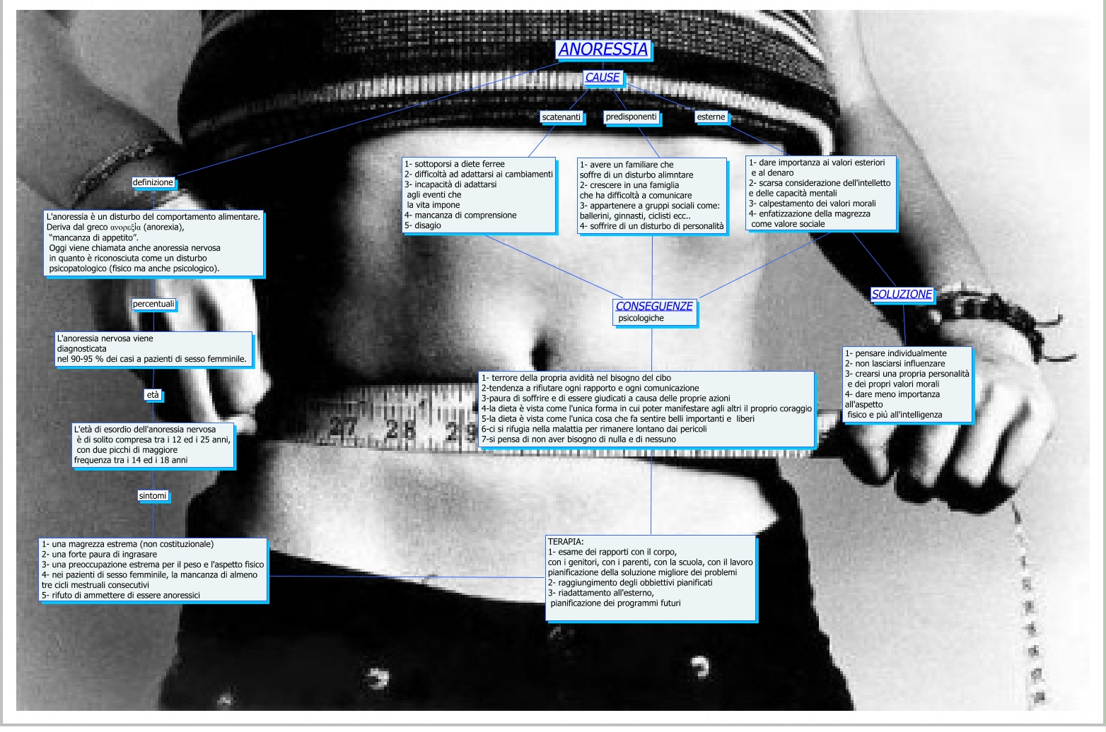 Questa Cmap, creata con IHMC CmapTools, contiene informazioni relative a: mappa anna, scatenanti ???? 1- sottoporsi a diete ferree 2- difficoltà ad adattarsi ai cambiamenti 3- incapacità di adattarsi agli eventi che la vita impone 4- mancanza di comprensione 5- disagio, 1- dare importanza ai valori esteriori e al denaro 2- scarsa considerazione dell'intelletto e delle capacità mentali 3- calpestamento dei valori morali 4- enfatizzazione della magrezza come valore sociale ???? CONSEGUENZE psicologiche, ANORESSIA CAUSE esterne, L'anoressia è un disturbo del comportamento alimentare. Deriva dal greco ανορεξία (anorexia), “mancanza di appetito”. Oggi viene chiamata anche anoressia nervosa in quanto è riconosciuta come un disturbo psicopatologico (fisico ma anche psicologico). percentuali L'anoressia nervosa viene diagnosticata nel 90-95 % dei casi a pazienti di sesso femminile., 1- avere un familiare che soffre di un disturbo alimntare 2- crescere in una famiglia che ha difficoltà a comunicare 3- appartenere a gruppi sociali come: ballerini, ginnasti, ciclisti ecc.. 4- soffrire di un disturbo di personalità ???? TERAPIA: 1- esame dei rapporti con il corpo, con i genitori, con i parenti, con la scuola, con il lavoro pianificazione della soluzione migliore dei problemi 2- raggiungimento degli obbiettivi pianificati 3- riadattamento all'esterno, pianificazione dei programmi futuri, ANORESSIA CAUSE predisponenti, ANORESSIA CAUSE scatenanti, predisponenti ???? 1- avere un familiare che soffre di un disturbo alimntare 2- crescere in una famiglia che ha difficoltà a comunicare 3- appartenere a gruppi sociali come: ballerini, ginnasti, ciclisti ecc.. 4- soffrire di un disturbo di personalità, ANORESSIA definizione L'anoressia è un disturbo del comportamento alimentare. Deriva dal greco ανορεξία (anorexia), “mancanza di appetito”. Oggi viene chiamata anche anoressia nervosa in quanto è riconosciuta come un disturbo psicopatologico (fisico ma anche psicologico)., 1- una magrezza estrema (non costituzionale) 2- una forte paura di ingrasare 3- una preoccupazione estrema per il peso e l'aspetto fisico 4- nei pazienti di sesso femminile, la mancanza di almeno tre cicli mestruali consecutivi 5- rifuto di ammettere di essere anoressici ???? TERAPIA: 1- esame dei rapporti con il corpo, con i genitori, con i parenti, con la scuola, con il lavoro pianificazione della soluzione migliore dei problemi 2- raggiungimento degli obbiettivi pianificati 3- riadattamento all'esterno, pianificazione dei programmi futuri, L'età di esordio dell'anoressia nervosa è di solito compresa tra i 12 ed i 25 anni, con due picchi di maggiore frequenza tra i 14 ed i 18 anni sintomi 1- una magrezza estrema (non costituzionale) 2- una forte paura di ingrasare 3- una preoccupazione estrema per il peso e l'aspetto fisico 4- nei pazienti di sesso femminile, la mancanza di almeno tre cicli mestruali consecutivi 5- rifuto di ammettere di essere anoressici, L'anoressia nervosa viene diagnosticata nel 90-95 % dei casi a pazienti di sesso femminile. età L'età di esordio dell'anoressia nervosa è di solito compresa tra i 12 ed i 25 anni, con due picchi di maggiore frequenza tra i 14 ed i 18 anni, 1- sottoporsi a diete ferree 2- difficoltà ad adattarsi ai cambiamenti 3- incapacità di adattarsi agli eventi che la vita impone 4- mancanza di comprensione 5- disagio ???? CONSEGUENZE psicologiche, esterne ???? 1- dare importanza ai valori esteriori e al denaro 2- scarsa considerazione dell'intelletto e delle capacità mentali 3- calpestamento dei valori morali 4- enfatizzazione della magrezza come valore sociale, 1- dare importanza ai valori esteriori e al denaro 2- scarsa considerazione dell'intelletto e delle capacità mentali 3- calpestamento dei valori morali 4- enfatizzazione della magrezza come valore sociale SOLUZIONE 1- pensare individualmente 2- non lasciarsi influenzare 3- crearsi una propria personalità e dei propri valori morali 4- dare meno importanza all'aspetto fisico e più all'intelligenza