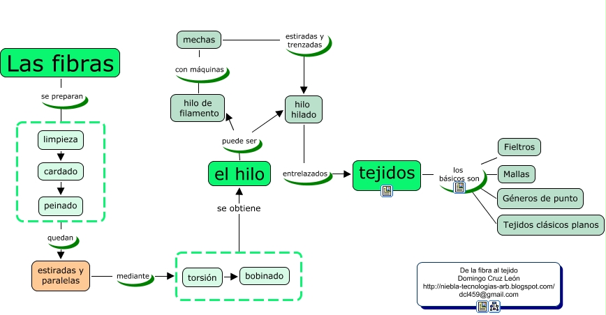 Este Cmap, tiene información relacionada con: ligamentos, tejidos los básicos son Géneros de punto, mechas estiradas y trenzadas hilo hilado, se obtiene el hilo, quedan estiradas y paralelas, tejidos los básicos son Mallas, tejidos los básicos son Tejidos clásicos planos, el hilo puede ser hilo hilado, tejidos los básicos son Fieltros, Las fibras se preparan, estiradas y paralelas mediante, el hilo puede ser hilo de filamento, cardado peinado, hilo de filamento con máquinas mechas, torsión bobinado, hilo hilado entrelazados tejidos, limpieza cardado