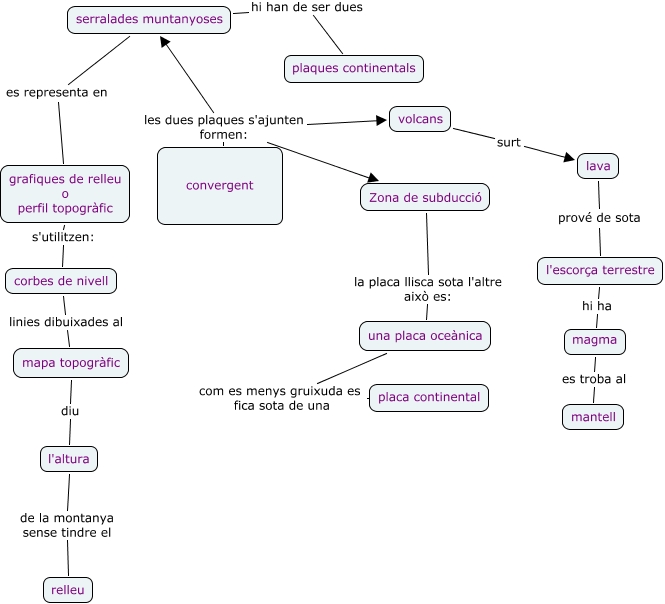 Este Cmap, tiene información relacionada con: geologia,placa(convergent), mapa topogràfic diu l'altura, serralades muntanyoses hi han de ser dues plaques continentals, lava prové de sota l'escorça terrestre, l'escorça terrestre hi ha magma, convergent les dues plaques s'ajunten formen: volcans, Zona de subducció la placa llisca sota l'altre això es: una placa oceànica, volcans surt lava, convergent les dues plaques s'ajunten formen: Zona de subducció, serralades muntanyoses es representa en grafiques de relleu o perfil topogràfic, una placa oceànica com es menys gruixuda es fica sota de una placa continental, l'altura de la montanya sense tindre el relleu, corbes de nivell linies dibuixades al mapa topogràfic, grafiques de relleu o perfil topogràfic s'utilitzen: corbes de nivell, convergent les dues plaques s'ajunten formen: serralades muntanyoses, magma es troba al mantell