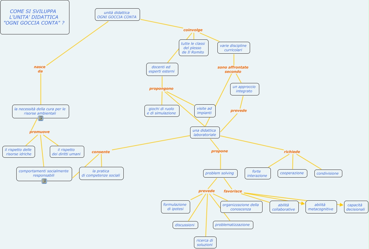unità didattica, problem solving prevede formulazione di ipotesi, unità didattica OGNI GOCCIA CONTA nasce da la necessità della cura per le risorse ambientali, unità didattica OGNI GOCCIA CONTA coinvolge varie discipline curricolari, problem solving favorisce abilità collaborative, problem solving prevede ricerca di soluzioni, la necessità della cura per le risorse ambientali promuove il rispetto dei diritti umani, una didattica laboratoriale richiede cooperazione, problem solving prevede organizzazione della conoscenza, docenti ed esperti esterni propongono giochi di ruolo e di simulazione, una didattica laboratoriale richiede forte interazione