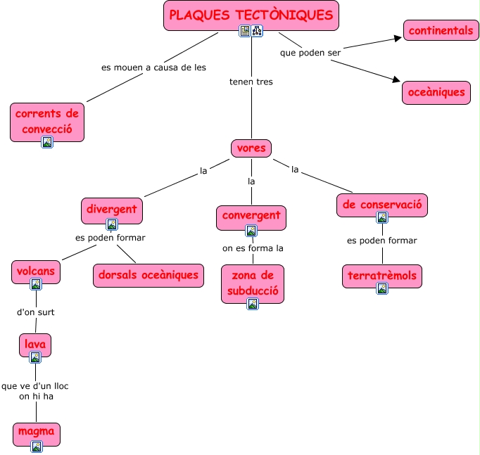 Este Cmap, tiene información relacionada con: Plaques tectòniques, PLAQUES TECTÒNIQUES tenen tres vores, vores la de conservació, divergent es poden formar dorsals oceàniques, vores la convergent, PLAQUES TECTÒNIQUES es mouen a causa de les corrents de convecció, divergent es poden formar volcans, de conservació es poden formar terratrèmols, volcans d'on surt lava, PLAQUES TECTÒNIQUES que poden ser continentals, PLAQUES TECTÒNIQUES que poden ser oceàniques, lava que ve d'un lloc on hi ha magma, convergent on es forma la zona de subducció, vores la divergent
