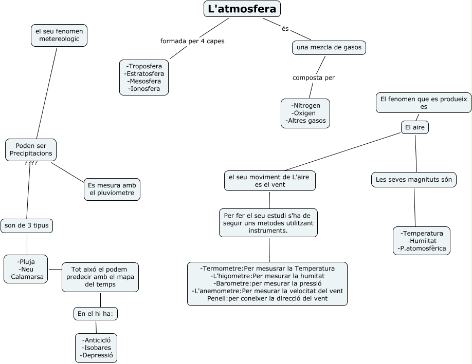 Este mapa conceptual tiene información relacionada a: L'atmosfera, El aire ???? el seu moviment de L'aire es el vent, Poden ser Precipitacions ???? Es mesura amb el pluviometre, L'atmosfera formada per 4 capes -Troposfera -Estratosfera -Mesosfera -Ionosfera, Les seves magnituts són ???? -Temperatura -Humiitat -P.atomosfèrica, Per fer el seu estudi s'ha de seguir uns metodes utilitzant instruments. ???? -Termometre:Per mesusrar la Temperatura -L'higometre:Per mesurar la humitat -Barometre:per mesurar la pressió -L'anemometre:Per mesurar la velocitat del vent Penell:per coneixer la direcció del vent, Tot aixó el podem predecir amb el mapa del temps ???? En el hi ha:, L'atmosfera és una mezcla de gasos, En el hi ha: ???? -Anticicló -Isobares -Depressió, El fenomen que es produeix es ???? El aire, una mezcla de gasos composta per -Nitrogen -Oxigen -Altres gasos, Poden ser Precipitacions ???? son de 3 tipus, el seu moviment de L'aire es el vent ???? Per fer el seu estudi s'ha de seguir uns metodes utilitzant instruments., son de 3 tipus ???? -Pluja -Neu -Calamarsa, El aire ???? Les seves magnituts són, -Pluja -Neu -Calamarsa ???? Tot aixó el podem predecir amb el mapa del temps, el seu fenomen metereologic ???? Poden ser Precipitacions