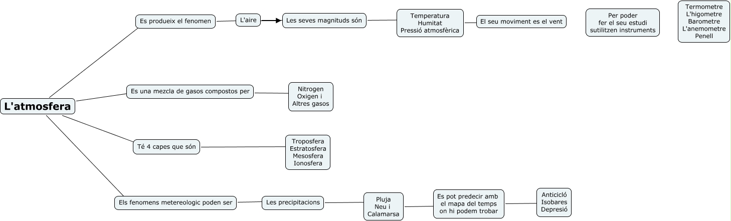 Este Cmap, tiene información relacionada con: L'atmosfera Recuperacion de 2nd ESO, L'atmosfera ???? Es una mezcla de gasos compostos per, L'atmosfera ???? Té 4 capes que són, L'aire ???? Les seves magnituds són, L'atmosfera ???? Es produeix el fenomen, Els fenomens metereologic poden ser ???? Les precipitacions, Temperatura Humitat Pressió atmosfèrica ???? El seu moviment es el vent, Les seves magnituds són ???? Temperatura Humitat Pressió atmosfèrica, Es produeix el fenomen ???? L'aire, Es produeix el fenomen ???? Les seves magnituds són, L'atmosfera ???? Els fenomens metereologic poden ser, Pluja Neu i Calamarsa ???? Es pot predecir amb el mapa del temps on hi podem trobar, Les precipitacions ???? Pluja Neu i Calamarsa, Té 4 capes que són ???? Troposfera Estratosfera Mesosfera Ionosfera, Es una mezcla de gasos compostos per ???? Nitrogen Oxigen i Altres gasos, Es pot predecir amb el mapa del temps on hi podem trobar ???? Anticicló Isobares Depresió