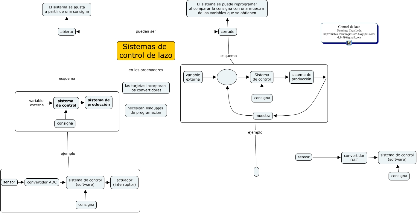 Este Cmap, tiene información relacionada con: control de lazo, consigna Sistema de control, consigna sistema de control (software), consigna sistema de control (software), ejemplo, cerrado esquema, abierto El sistema se ajusta a partir de una consigna, sensor convertidor DAC, abierto esquema, Sistemas de control de lazo en los ordenadores las tarjetas incorporan los convertidores, convertidor DAC sistema de control (software), sistema de control sistema de producción, sistema de producción, cerrado El sistema se puede reprogramar al comparar la consigna con una muestra de las variables que se obtienen, convertidor ADC sistema de control (software), Sistema de control, variable externa sistema de control, sensor convertidor ADC, consigna sistema de control, muestra, las tarjetas incorporan los convertidores necesitan lenguajes de programación